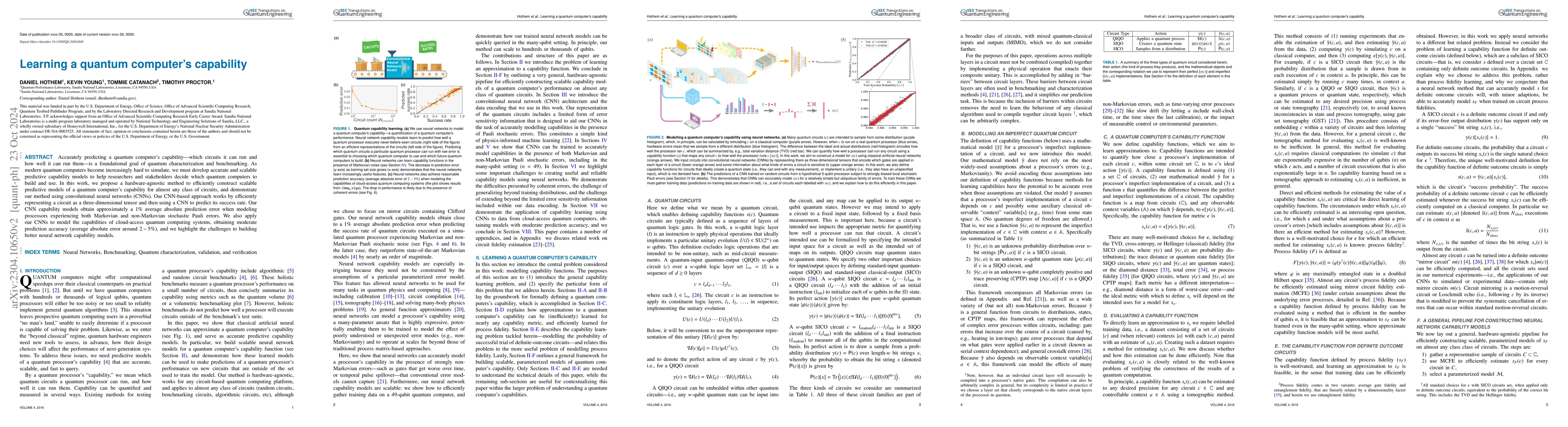 This paper explores using convolutional neural networks to approximate the capability function of quantum computers, which maps quantum circuits to success rates despite hardware errors. Simulations show that these networks can accurately model processors with various stochastic errors, though challenges remain in generalizing and modeling coherent errors.