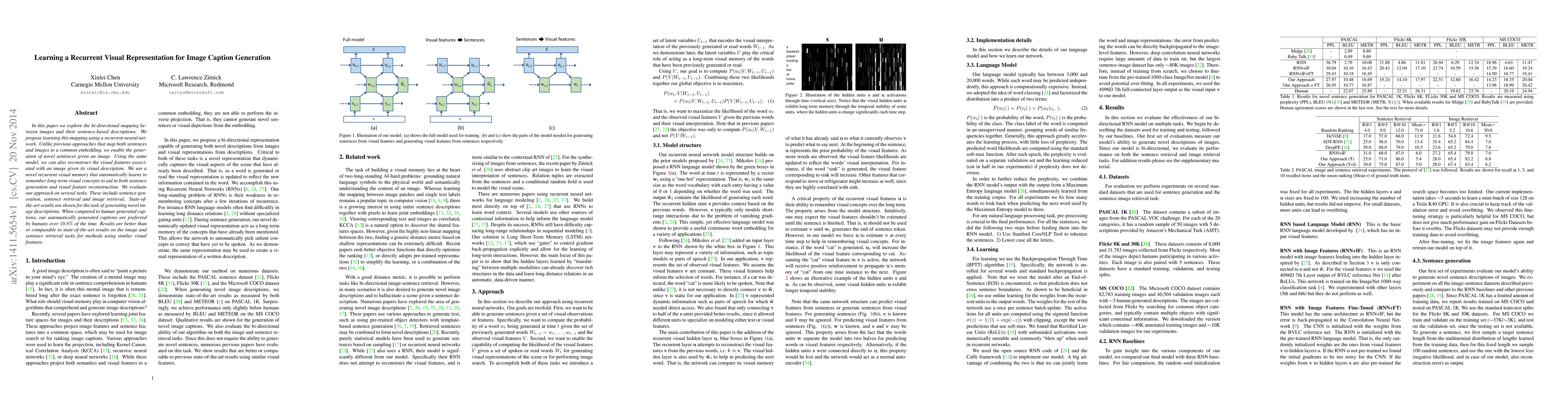 In this paper we explore the bi-directional mapping between images and their sentence-based descriptions. We propose learning this mapping using a recurrent neural network. Unlike previous approaches that map both sentences and images to a common embedding, we enable the generation of novel sentences given an image. Using the same model, we can also reconstruct the visual features associated with an image given its visual description. We use a novel recurrent visual memory that automatically learns to remember long-term visual concepts to aid in both sentence generation and visual feature reconstruction. We evaluate our approach on several tasks. These include sentence generation, sentence retrieval and image retrieval. State-of-the-art results are shown for the task of generating novel image descriptions. When compared to human generated captions, our automatically generated captions are preferred by humans over $19.8\%$ of the time. Results are better than or comparable to state-of-the-art results on the image and sentence retrieval tasks for methods using similar visual features.