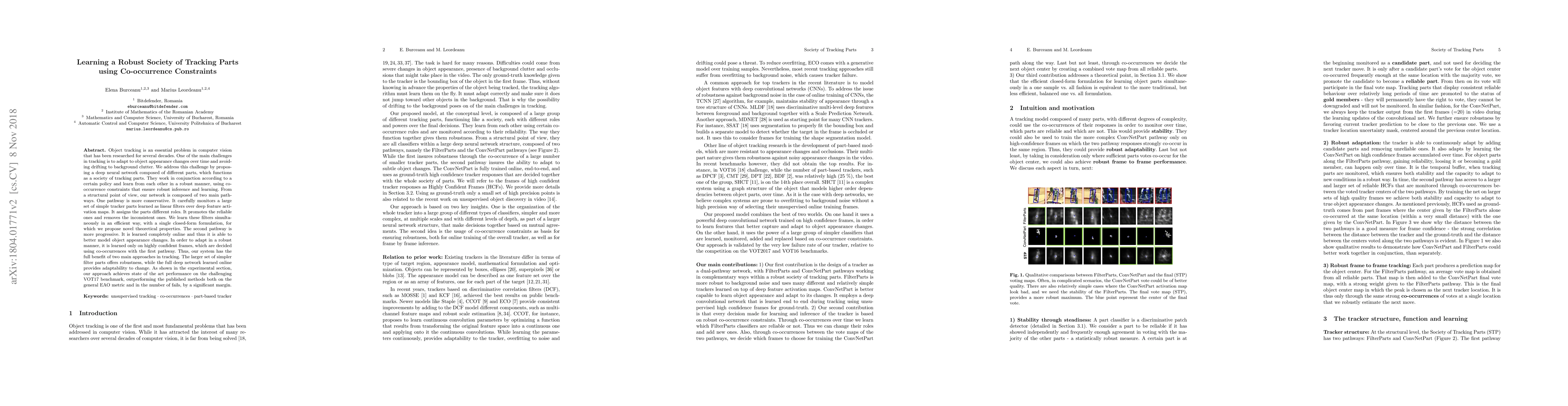 Object tracking is an essential problem in computer vision that has been researched for several decades. One of the main challenges in tracking is to adapt to object appearance changes over time and avoiding drifting to background clutter. We address this challenge by proposing a deep neural network composed of different parts, which functions as a society of tracking parts. They work in conjunction according to a certain policy and learn from each other in a robust manner, using co-occurrence constraints that ensure robust inference and learning. From a structural point of view, our network is composed of two main pathways. One pathway is more conservative. It carefully monitors a large set of simple tracker parts learned as linear filters over deep feature activation maps. It assigns the parts different roles. It promotes the reliable ones and removes the inconsistent ones. We learn these filters simultaneously in an efficient way, with a single closed-form formulation, for which we propose novel theoretical properties. The second pathway is more progressive. It is learned completely online and thus it is able to better model object appearance changes. In order to adapt in a robust manner, it is learned only on highly confident frames, which are decided using co-occurrences with the first pathway. Thus, our system has the full benefit of two main approaches in tracking. The larger set of simpler filter parts offers robustness, while the full deep network learned online provides adaptability to change. As shown in the experimental section, our approach achieves state of the art performance on the challenging VOT17 benchmark, outperforming the published methods both on the general EAO metric and in the number of fails, by a significant margin.
