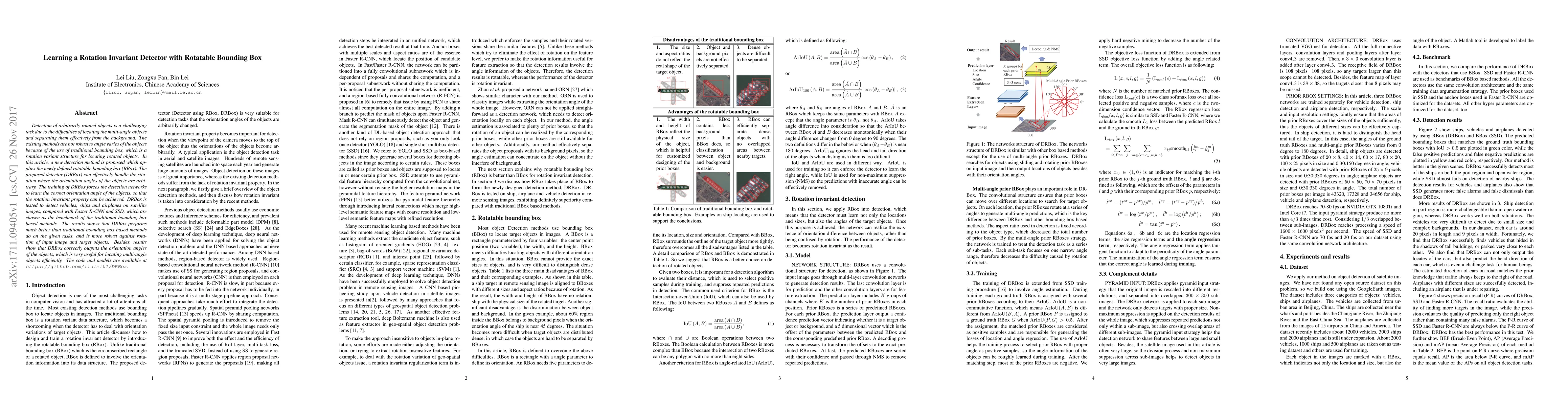 This paper proposes a new detection method called DRBox that uses a rotatable bounding box (RBox) to detect objects with arbitrary orientations. The method outperforms traditional bounding box-based detectors like Faster R-CNN and SSD, showing better robustness to object rotation and more accurate orientation angle outputs.