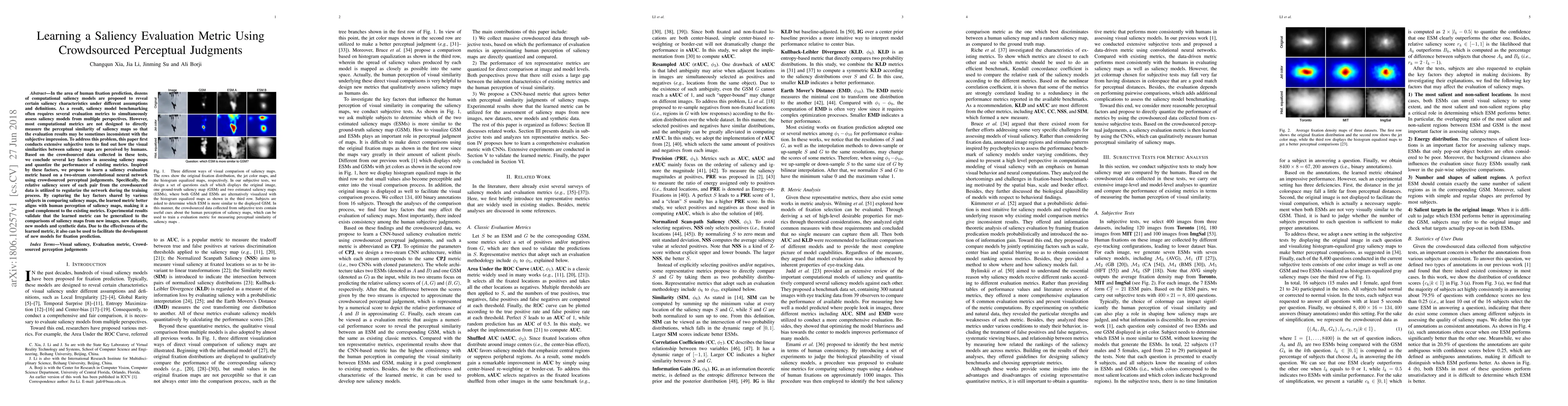 This paper investigates how to develop a saliency evaluation metric that aligns with human perception by using crowdsourced perceptual judgments. It proposes a two-stream convolutional neural network trained with subjective test data to learn a metric that better captures the key factors in human comparison of saliency maps, thus complementing existing metrics.