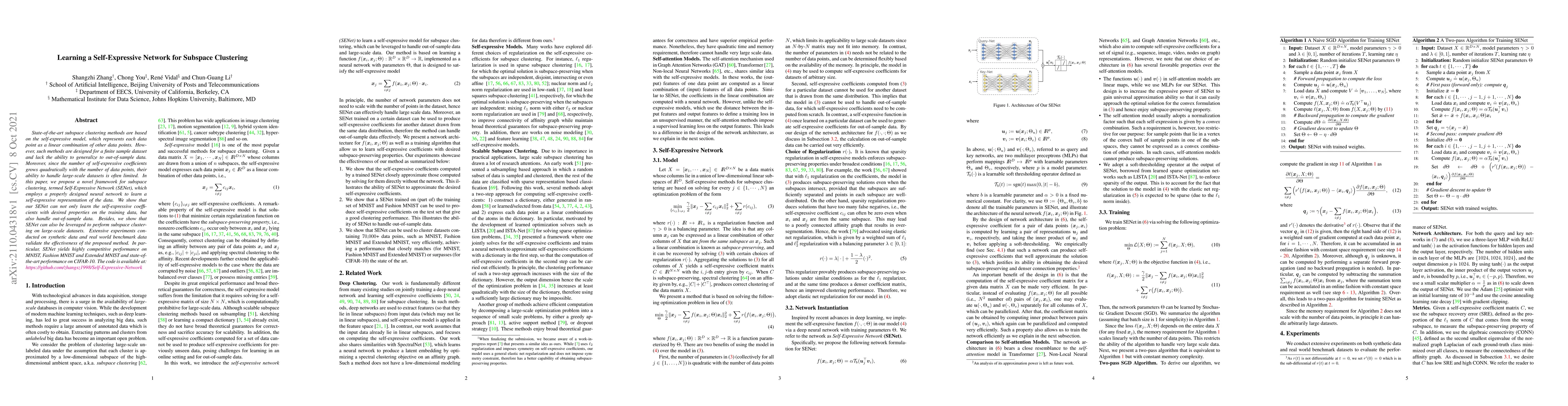 This paper introduces Self-Expressive Network (SENet), a novel framework for subspace clustering that leverages neural networks to learn self-expressive representations, enabling it to generalize to out-of-sample data and handle large-scale datasets effectively. Experimental results demonstrate SENet's competitive performance on various datasets, including MNIST and CIFAR-10.
