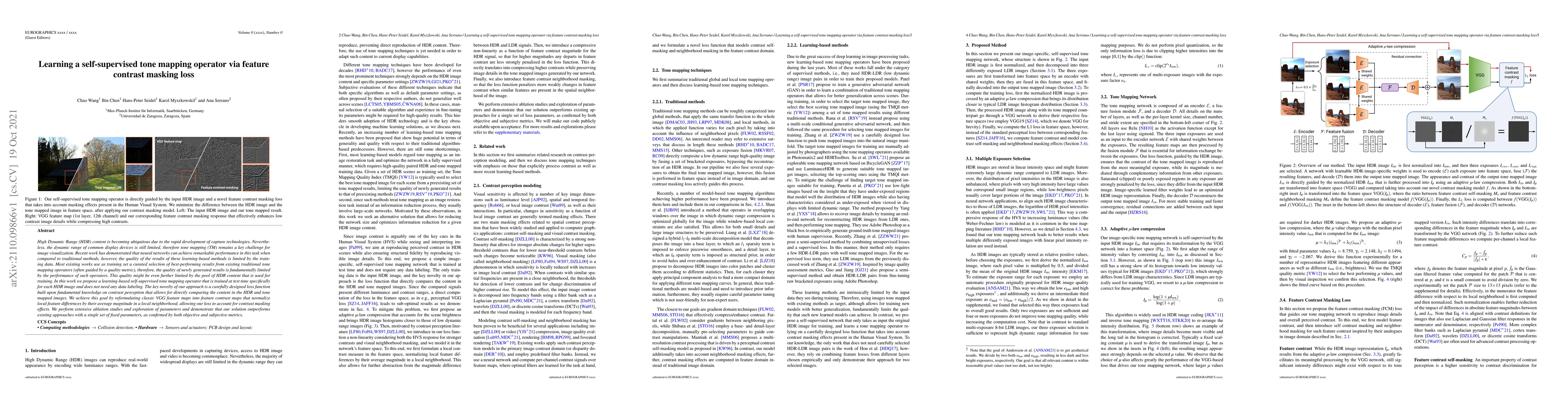 A self-supervised tone mapping operator is proposed that learns to map High Dynamic Range images without requiring labeled training data. It uses a novel loss function based on contrast perception, achieving superior performance compared to existing methods.
