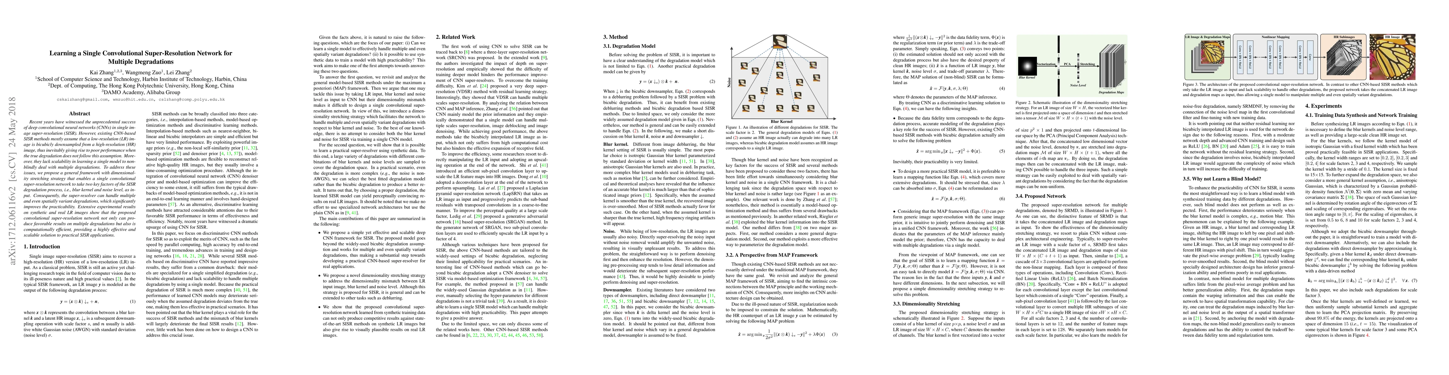 This paper proposes a convolutional super-resolution network capable of handling multiple degradations, including blur and noise, by incorporating a dimensionality stretching strategy. The network's scalability and efficiency are demonstrated through extensive experiments on synthetic and real low-resolution images.