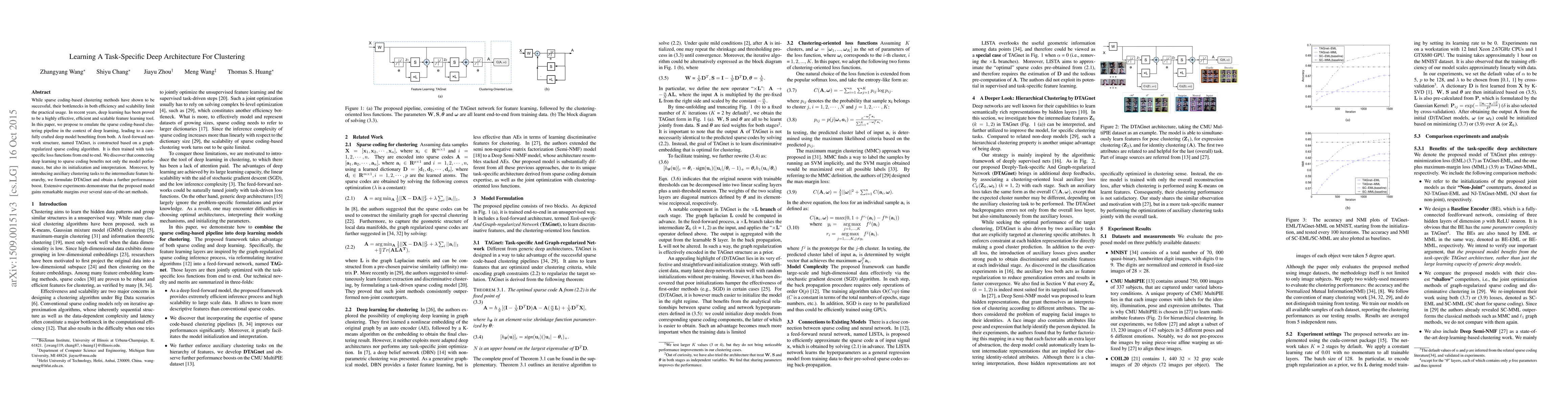 This paper proposes TAGnet, a deep architecture combining deep learning and sparse coding for clustering, addressing efficiency and scalability issues of traditional sparse coding methods. The model, enhanced by auxiliary clustering tasks, outperforms state-of-the-art methods in extensive experiments.
