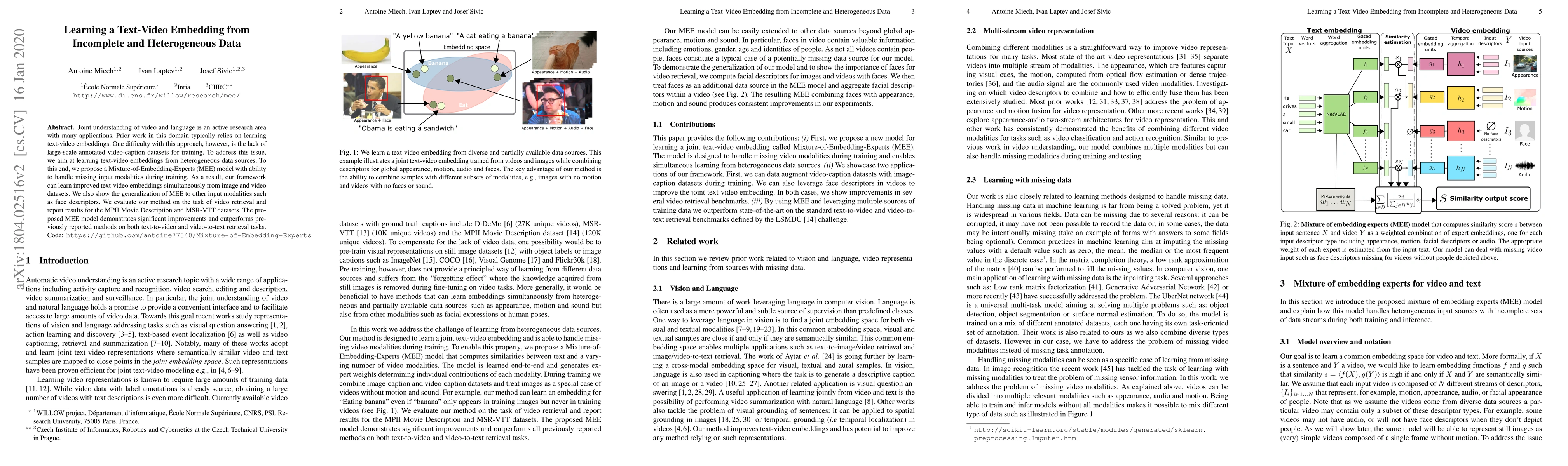 This paper proposes a Mixture-of-Embedding-Experts (MEE) model to learn text-video embeddings from heterogeneous and incomplete data sources, addressing the lack of large-scale annotated datasets. The MEE model shows significant improvements in text-to-video and video-to-text retrieval tasks on MPII and MSR-VTT datasets.