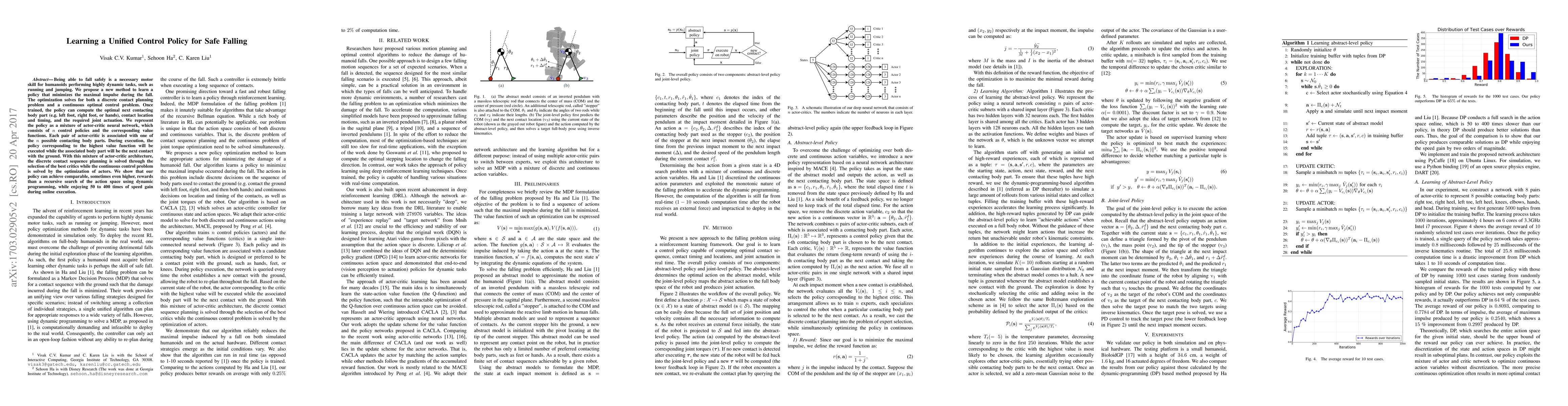 Being able to fall safely is a necessary motor skill for humanoids performing highly dynamic tasks, such as running and jumping. We propose a new method to learn a policy that minimizes the maximal impulse during the fall. The optimization solves for both a discrete contact planning problem and a continuous optimal control problem. Once trained, the policy can compute the optimal next contacting body part (e.g. left foot, right foot, or hands), contact location and timing, and the required joint actuation. We represent the policy as a mixture of actor-critic neural network, which consists of n control policies and the corresponding value functions. Each pair of actor-critic is associated with one of the n possible contacting body parts. During execution, the policy corresponding to the highest value function will be executed while the associated body part will be the next contact with the ground. With this mixture of actor-critic architecture, the discrete contact sequence planning is solved through the selection of the best critics while the continuous control problem is solved by the optimization of actors. We show that our policy can achieve comparable, sometimes even higher, rewards than a recursive search of the action space using dynamic programming, while enjoying 50 to 400 times of speed gain during online execution.