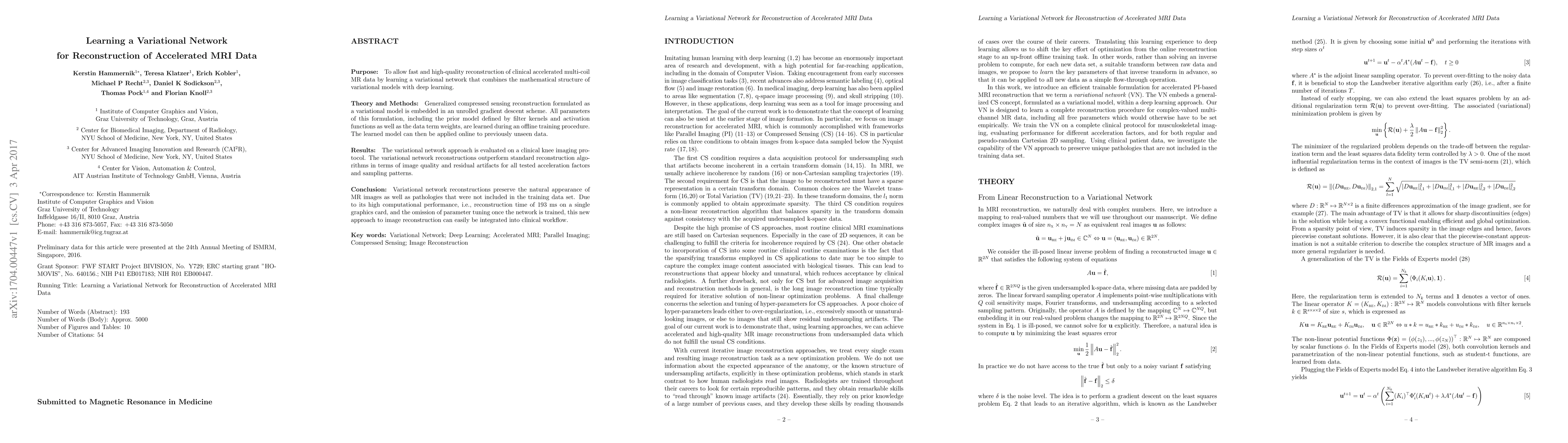 This paper proposes a variational network for fast and high-quality reconstruction of accelerated MRI data, combining variational models with deep learning. The network outperforms standard algorithms in image quality and artifact reduction, with a reconstruction time of 193 ms, making it suitable for clinical use.