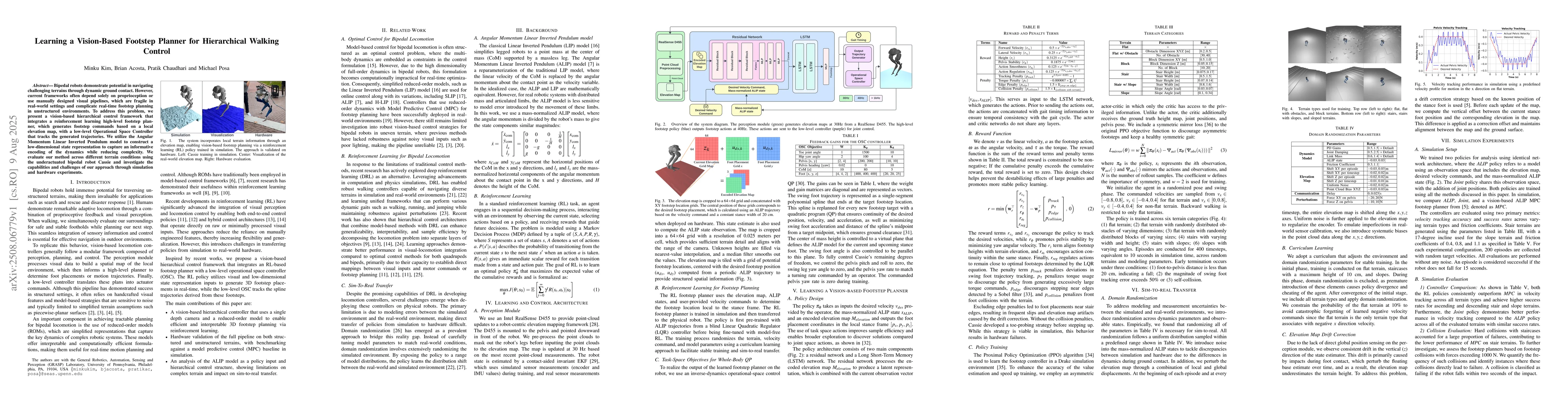 The research presents a vision-based hierarchical control framework for bipedal robots, integrating a reinforcement learning high-level footstep planner with a low-level Operational Space Controller, utilizing the Angular Momentum Linear Inverted Pendulum (ALIP) model for state representation.