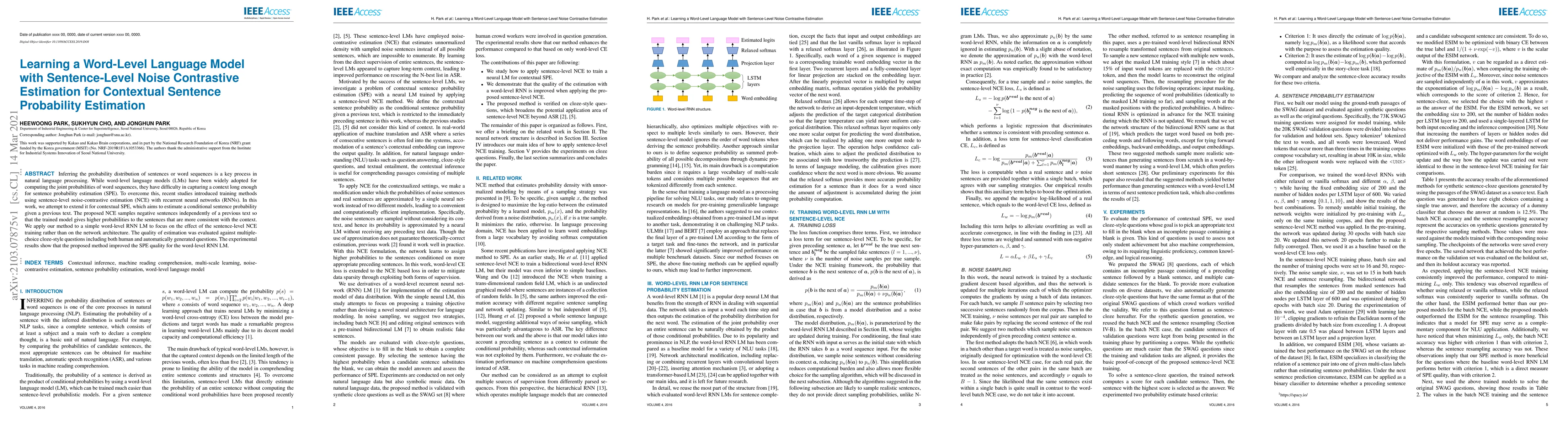 This paper proposes a sentence-level noise-contrastive estimation (NCE) method for training word-level language models to improve contextual sentence probability estimation (SPE). The method samples negative sentences independently of previous text, enhancing the model's ability to assign higher probabilities to contextually consistent sentences, leading to improved SPE quality as demonstrated through cloze-style question evaluations.