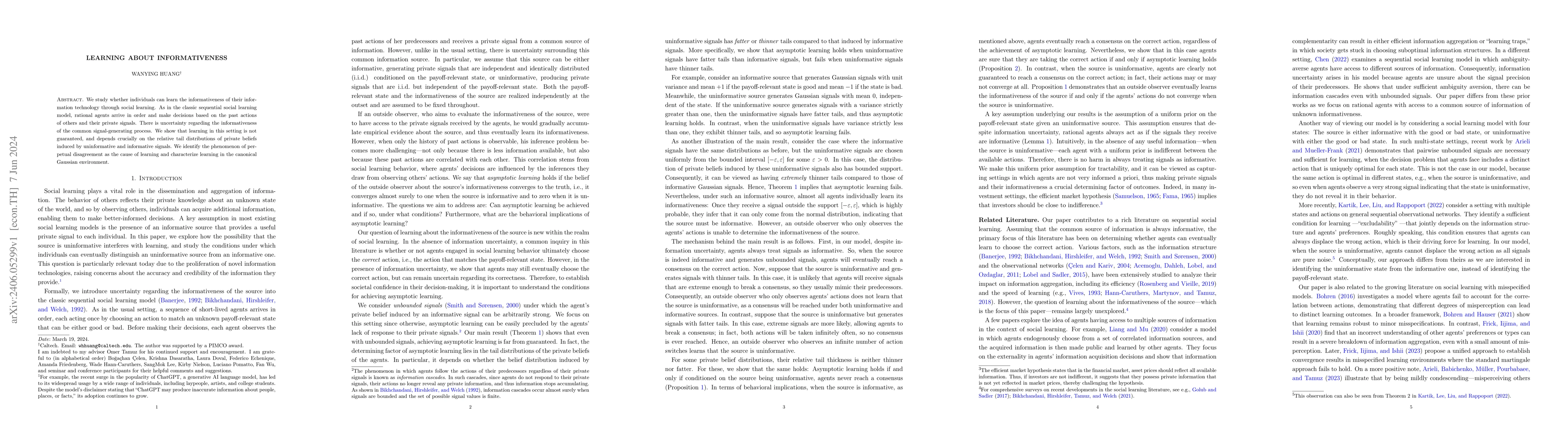 This paper investigates how individuals can discern the informativeness of their information technology via social learning. It finds that while social learning can occur, it is not guaranteed and hinges on the comparative tail distributions of beliefs derived from uninformative versus informative signals, leading to perpetual disagreement.