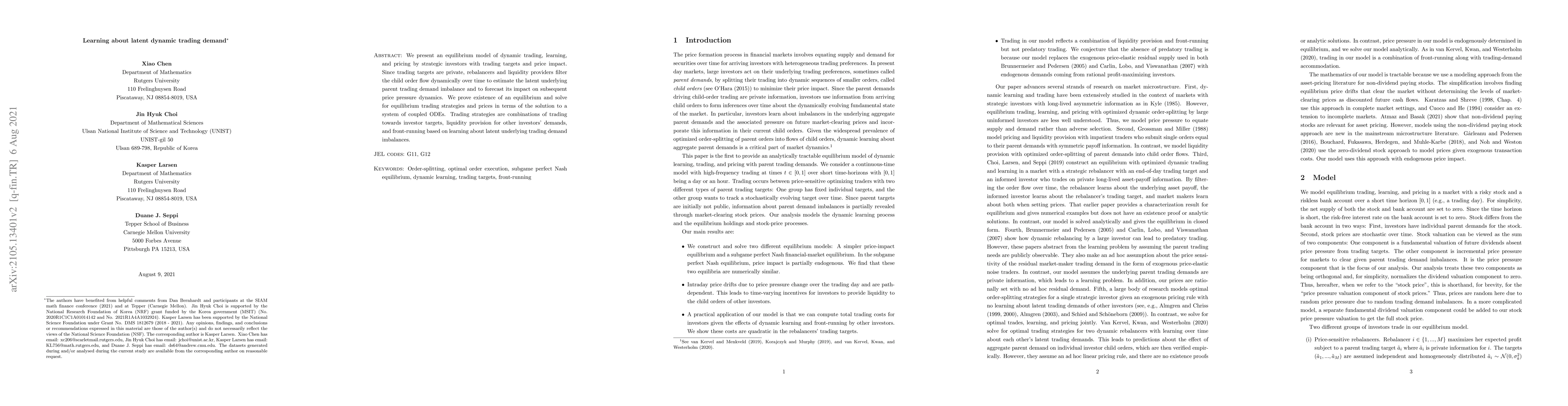 This paper presents an equilibrium model of dynamic trading, learning, and pricing by strategic investors with trading targets and price impact. Since trading targets are private, rebalancers and liquidity providers filter the child order flow over time to estimate the latent underlying parent trading demand imbalance and its expected impact on subsequent price pressure dynamics. We prove existence of the equilibrium and solve for equilibrium trading strategies and prices in terms of the solution to a system of coupled ODEs. We show that trading strategies are combinations of trading towards investor targets, liquidity provision for other investors' demands, and front-running based on learning about latent underlying trading demand imbalances and future price pressure.