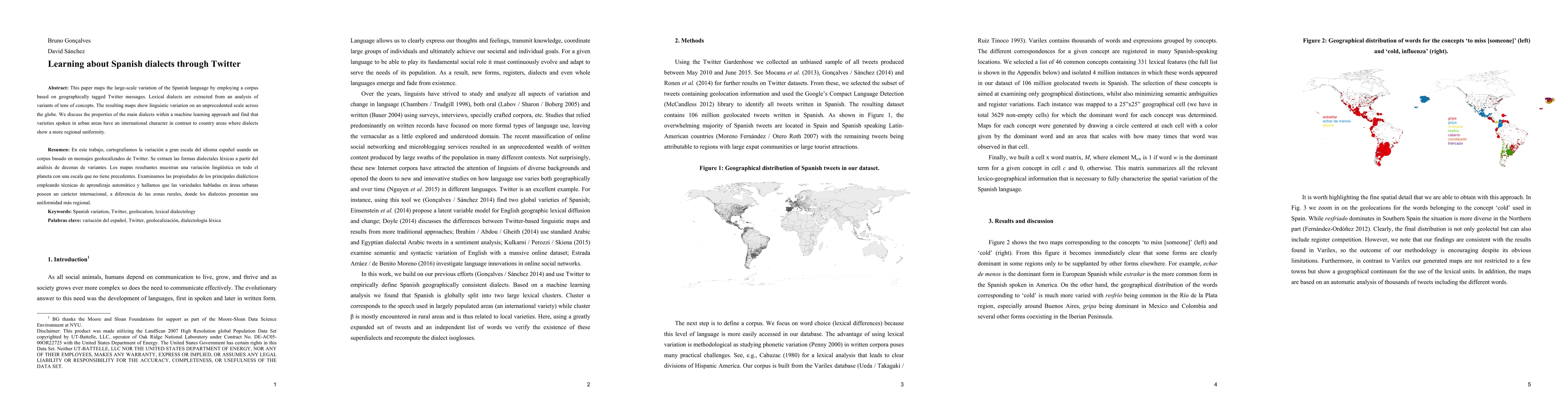 This study maps large-scale variation in Spanish dialects using Twitter data, revealing unprecedented global linguistic patterns. Urban areas show international character, while rural regions display regional uniformity.