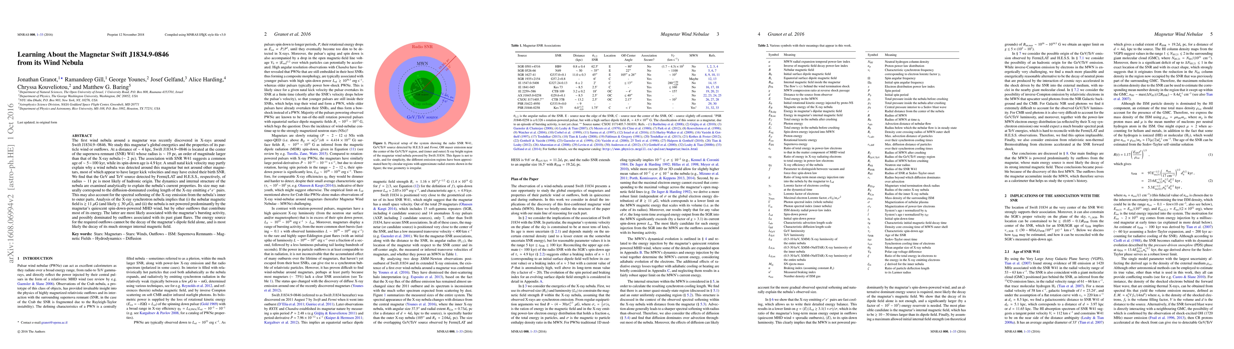 The first wind nebula around a magnetar was recently discovered in X-rays around Swift~J1834.9$-$0846. We study this magnetar's global energetics and the properties of its particle wind or outflows. At a distance of $\sim4\;$kpc, Swift~J1834.9$-$0846 is located at the center of the supernova remnant (SNR) W41 whose radius is $\sim 19\;$pc, an order of magnitude larger than that of the X-ray nebula ($\sim2\;$pc). The association with SNR W41 suggests a common age of $\sim5-100\;$kyr, while its spin-down age is $4.9$~kyr. A small natal kick velocity may partly explain why a wind nebula was detected around this magnetar but not around other magnetars, most of which appear to have larger kick velocities and may have exited their birth SNR. We find that the GeV and TeV source detected by Fermi/LAT and H.E.S.S., respectively, of radius $\sim11\;$pc is most likely of hadronic origin. The dynamics and internal structure of the nebula are examined analytically to explain the nebula's current properties. Its size may naturally correspond to the diffusion-dominated cooling length of the X-ray emitting $e^+e^-$ pairs. This may also account for the spectral softening of the X-ray emission from the nebula's inner to outer parts. Analysis of the X-ray synchrotron nebula implies that (i) the nebular magnetic field is $\gtrsim 11\;\mu$G (and likely $\lesssim30\;\mu$G), and (ii) the nebula is not powered predominantly by the magnetar's quiescent spin-down-powered MHD wind, but by other outflows that contribute most of its energy. The latter are most likely associated with the magnetar's bursting activity, and possibly dominated by outflows associated with its past giant flares. The energy source for the required outflows cannot be the decay of the magnetar's dipole field alone, and is most likely the decay of its much stronger internal magnetic field.