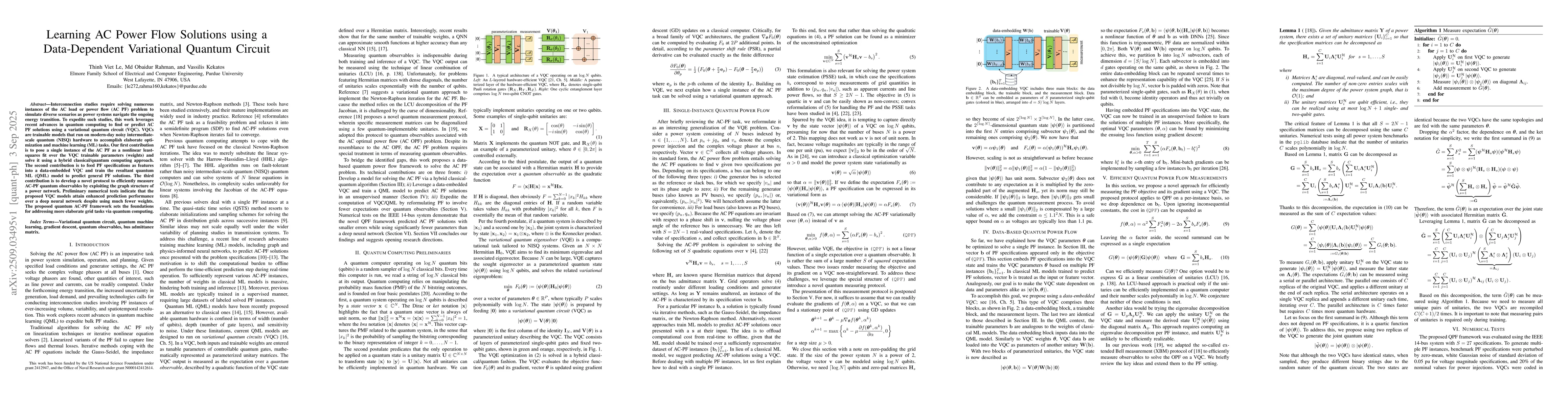 Interconnection studies require solving numerous instances of the AC load or power flow (AC PF) problem to simulate diverse scenarios as power systems navigate the ongoing energy transition. To expedite such studies, this work leverages recent advances in quantum computing to find or predict AC PF solutions using a variational quantum circuit (VQC). VQCs are trainable models that run on modern-day noisy intermediate-scale quantum (NISQ) hardware to accomplish elaborate optimization and machine learning (ML) tasks. Our first contribution is to pose a single instance of the AC PF as a nonlinear least-squares fit over the VQC trainable parameters (weights) and solve it using a hybrid classical/quantum computing approach. The second contribution is to feed PF specifications as features into a data-embedded VQC and train the resultant quantum ML (QML) model to predict general PF solutions. The third contribution is to develop a novel protocol to efficiently measure AC-PF quantum observables by exploiting the graph structure of a power network. Preliminary numerical tests indicate that the proposed VQC models attain enhanced prediction performance over a deep neural network despite using much fewer weights. The proposed quantum AC-PF framework sets the foundations for addressing more elaborate grid tasks via quantum computing.