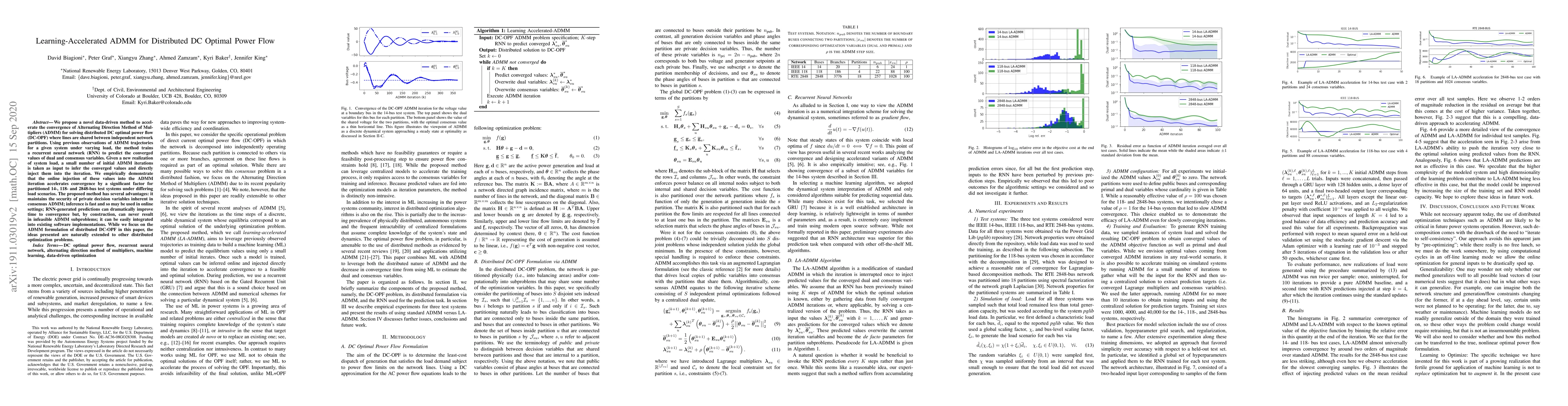 This paper proposes a learning-accelerated ADMM method using RNN to predict converged values for distributed DC-OPF, significantly speeding up convergence without compromising feasibility or privacy. The method is shown to work efficiently across various system sizes and load conditions.