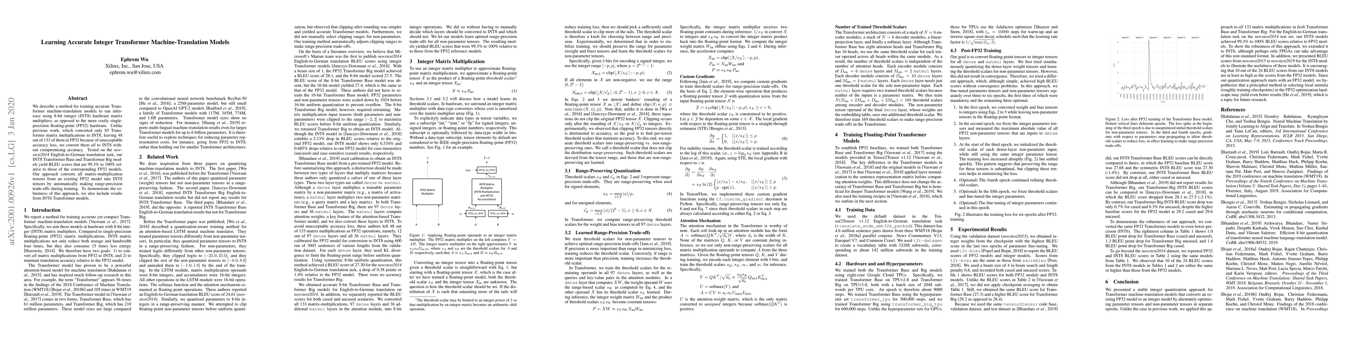 We describe a method for training accurate Transformer machine-translation models to run inference using 8-bit integer (INT8) hardware matrix multipliers, as opposed to the more costly single-precision floating-point (FP32) hardware. Unlike previous work, which converted only 85 Transformer matrix multiplications to INT8, leaving 48 out of 133 of them in FP32 because of unacceptable accuracy loss, we convert them all to INT8 without compromising accuracy. Tested on the newstest2014 English-to-German translation task, our INT8 Transformer Base and Transformer Big models yield BLEU scores that are 99.3% to 100% relative to those of the corresponding FP32 models. Our approach converts all matrix-multiplication tensors from an existing FP32 model into INT8 tensors by automatically making range-precision trade-offs during training. To demonstrate the robustness of this approach, we also include results from INT6 Transformer models.