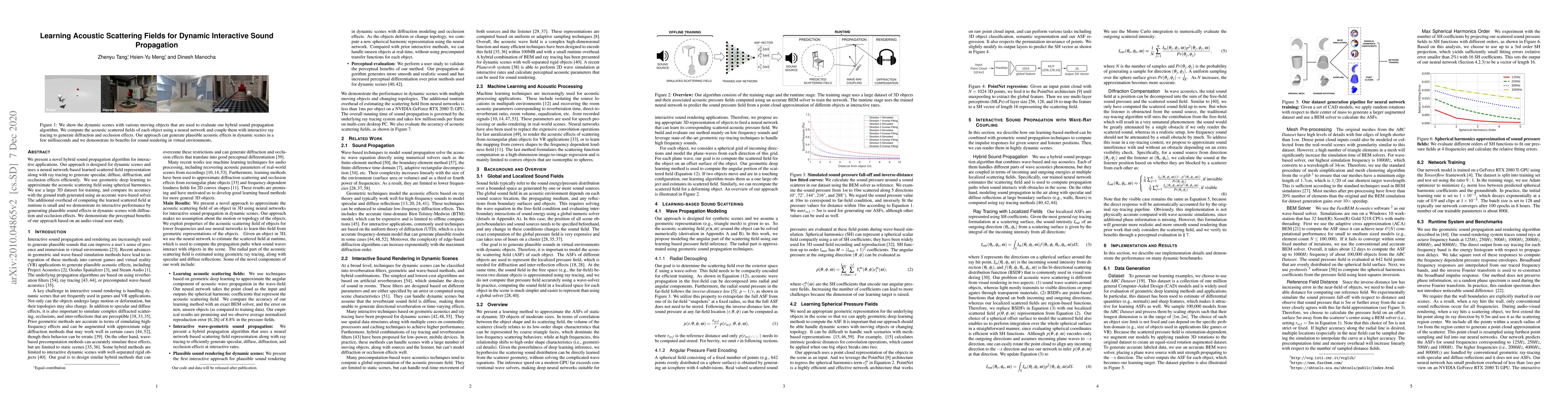 This paper introduces a hybrid algorithm combining neural networks and ray tracing for efficient sound propagation in dynamic scenes, leveraging geometric deep learning to approximate acoustic scattering fields. The approach demonstrates interactive performance and perceptual benefits through a user study, showing accurate sound effects with minimal runtime overhead.