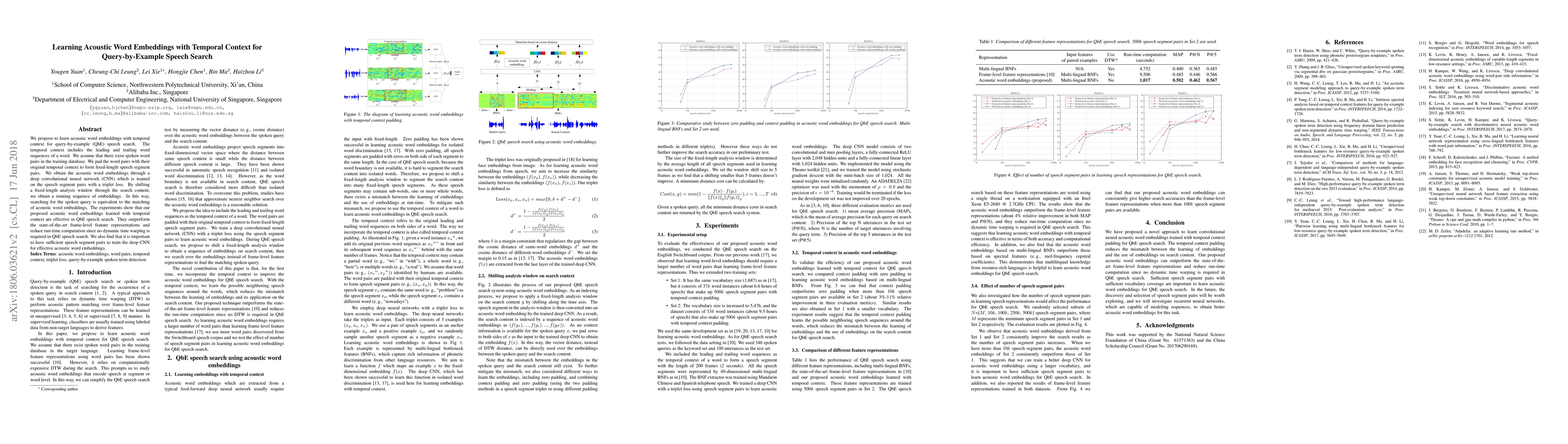 This paper proposes learning acoustic word embeddings with temporal context for query-by-example speech search, using deep CNNs trained on padded word pairs and achieving better performance and reduced computation compared to frame-level methods. Effective embeddings require sufficient training speech segment pairs.