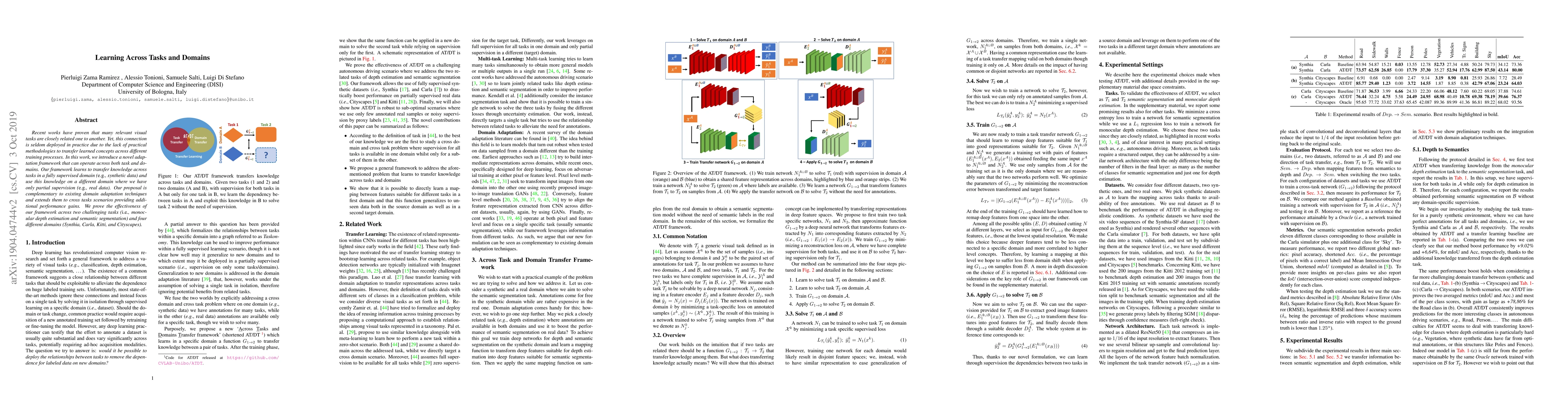 Recent works have proven that many relevant visual tasks are closely related one to another. Yet, this connection is seldom deployed in practice due to the lack of practical methodologies to transfer learned concepts across different training processes. In this work, we introduce a novel adaptation framework that can operate across both task and domains. Our framework learns to transfer knowledge across tasks in a fully supervised domain (e.g., synthetic data) and use this knowledge on a different domain where we have only partial supervision (e.g., real data). Our proposal is complementary to existing domain adaptation techniques and extends them to cross tasks scenarios providing additional performance gains. We prove the effectiveness of our framework across two challenging tasks (i.e., monocular depth estimation and semantic segmentation) and four different domains (Synthia, Carla, Kitti, and Cityscapes).