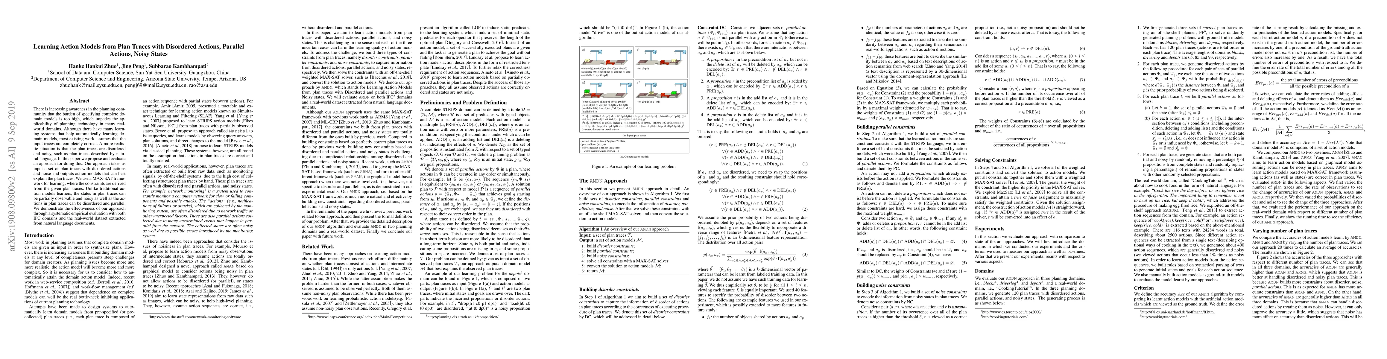 This paper proposes a method for learning action models from disordered and noisy plan traces, addressing the challenge of incomplete domain models. It employs a MAX-SAT framework to handle partially observable and noisy states, and disordered or parallel actions, demonstrating effectiveness through empirical evaluations on IPC domains and natural language data.