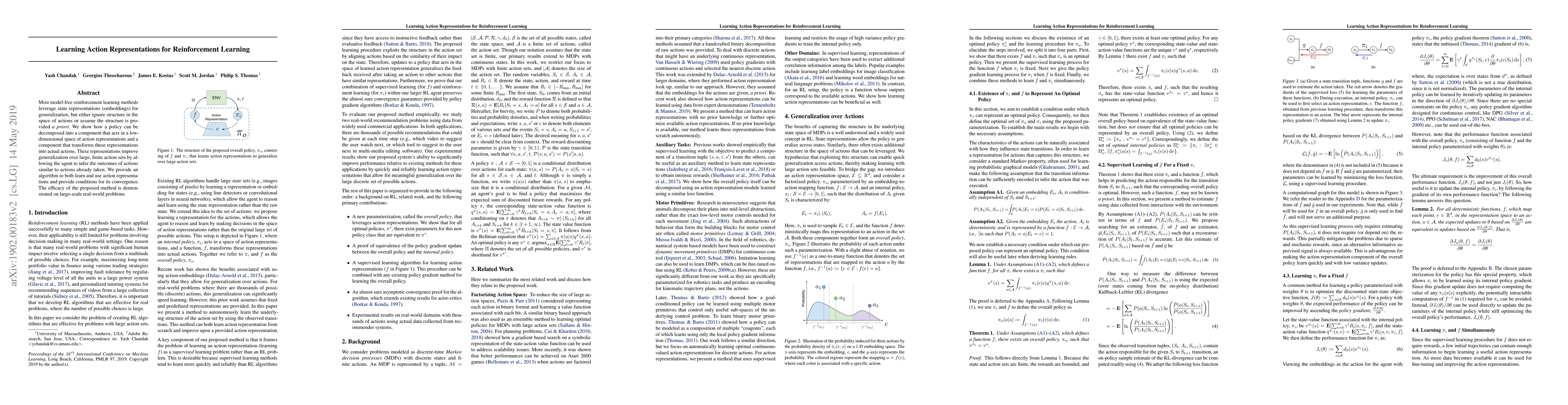 Most model-free reinforcement learning methods leverage state representations (embeddings) for generalization, but either ignore structure in the space of actions or assume the structure is provided a priori. We show how a policy can be decomposed into a component that acts in a low-dimensional space of action representations and a component that transforms these representations into actual actions. These representations improve generalization over large, finite action sets by allowing the agent to infer the outcomes of actions similar to actions already taken. We provide an algorithm to both learn and use action representations and provide conditions for its convergence. The efficacy of the proposed method is demonstrated on large-scale real-world problems.
