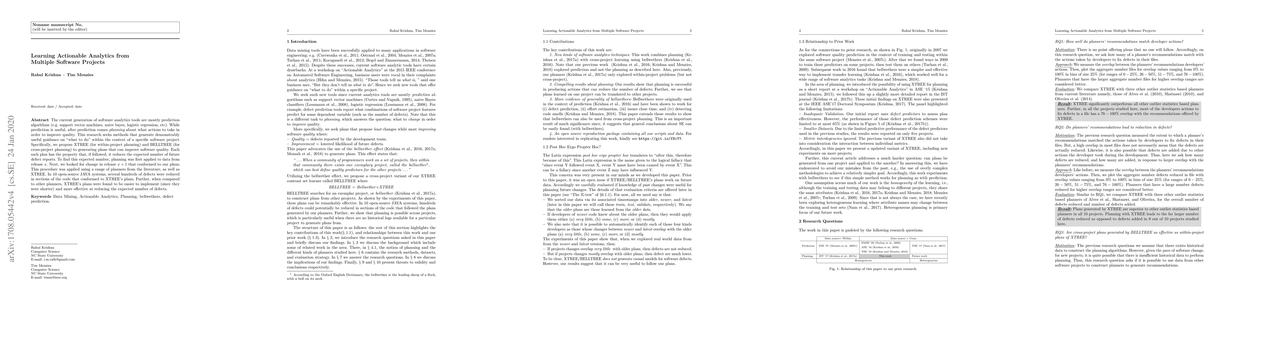 Researchers developed two planning methods, XTREE and BELLTREE, to generate actionable analytics for improving software quality, resulting in a 10% reduction in defects in open-source Java systems.