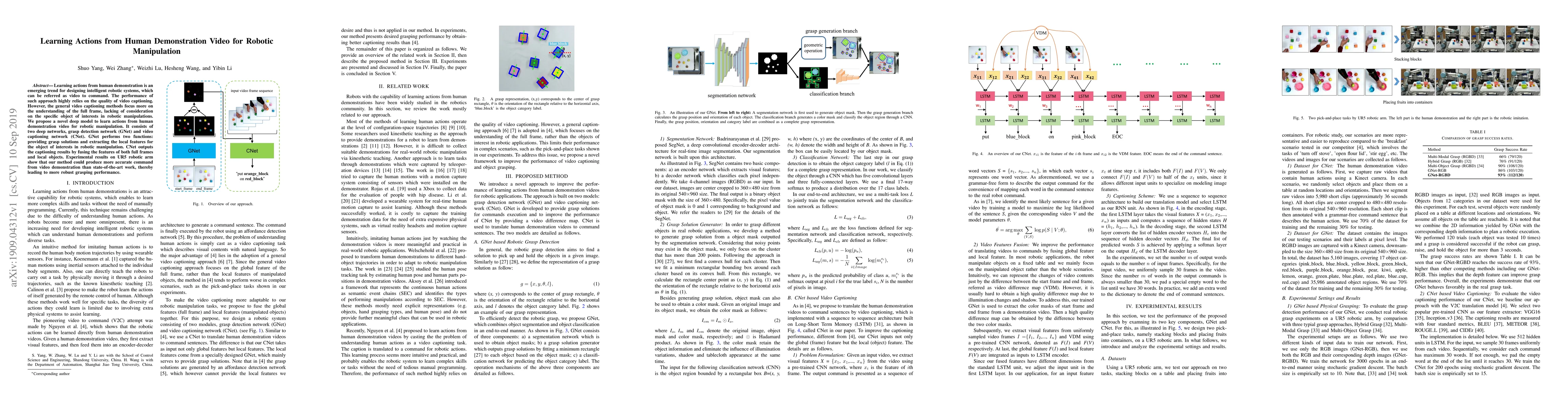 This paper proposes a novel deep model for learning robotic manipulation actions from human demonstration videos, consisting of a grasp detection network (GNet) and a video captioning network (CNet). The method achieves more accurate commands and better grasp performance compared to state-of-the-art approaches, demonstrating robust robotic manipulation.