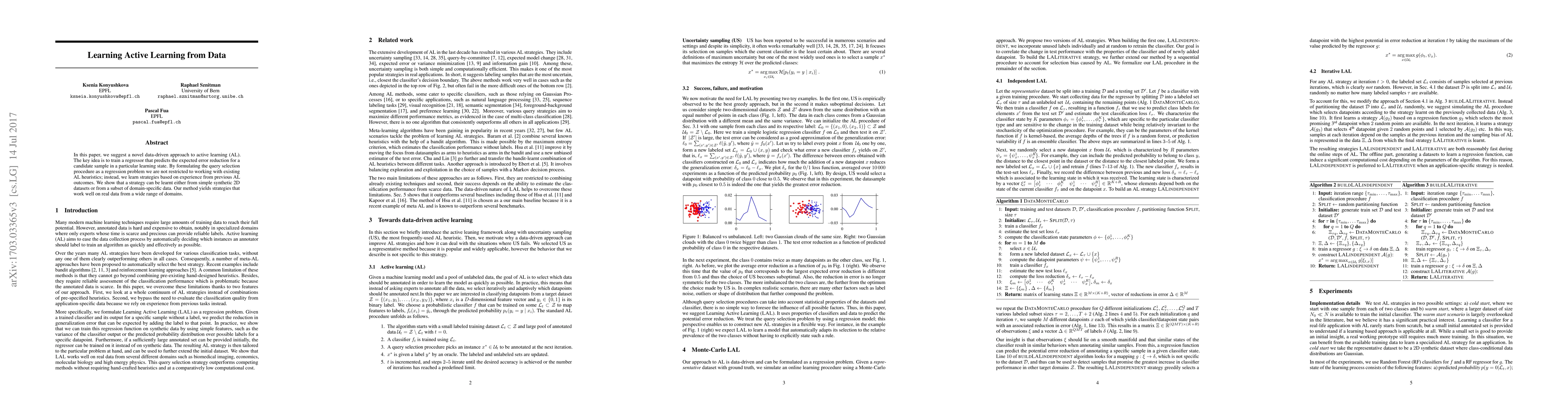 The paper proposes a data-driven approach to active learning (AL) by training a regressor to predict the expected error reduction for a candidate sample in a specific learning state, learning strategies from experience rather than relying on existing AL heuristics.
