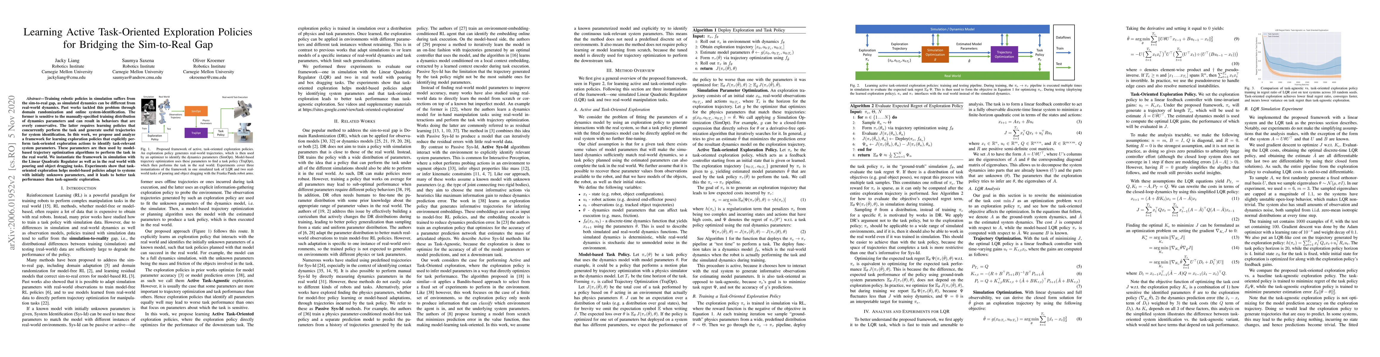 Training robotic policies in simulation suffers from the sim-to-real gap, as simulated dynamics can be different from real-world dynamics. Past works tackled this problem through domain randomization and online system-identification. The former is sensitive to the manually-specified training distribution of dynamics parameters and can result in behaviors that are overly conservative. The latter requires learning policies that concurrently perform the task and generate useful trajectories for system identification. In this work, we propose and analyze a framework for learning exploration policies that explicitly perform task-oriented exploration actions to identify task-relevant system parameters. These parameters are then used by model-based trajectory optimization algorithms to perform the task in the real world. We instantiate the framework in simulation with the Linear Quadratic Regulator as well as in the real world with pouring and object dragging tasks. Experiments show that task-oriented exploration helps model-based policies adapt to systems with initially unknown parameters, and it leads to better task performance than task-agnostic exploration.