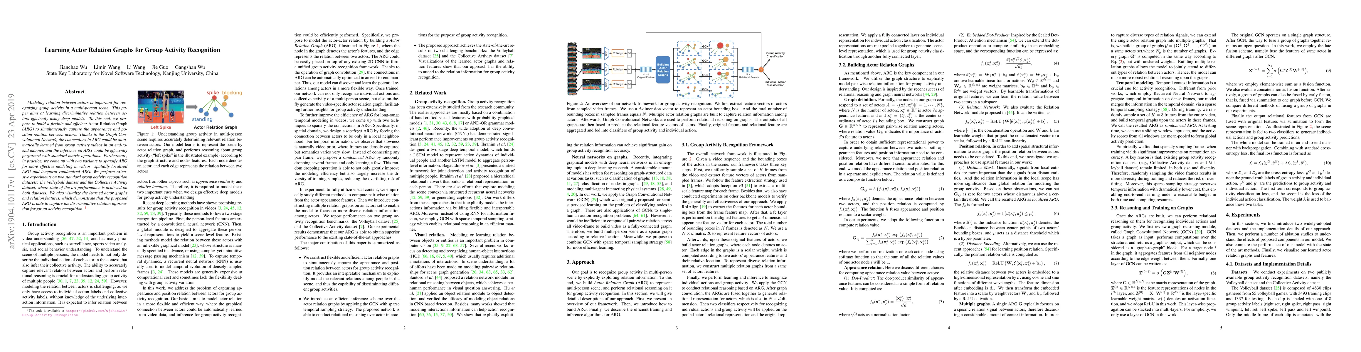 This paper proposes an Actor Relation Graph (ARG) to efficiently model and recognize group activities by capturing the discriminative relations between actors using deep learning. The ARG leverages Graph Convolutional Networks for automatic learning and efficient inference, with variants for sparsification, achieving state-of-the-art performance on two datasets.
