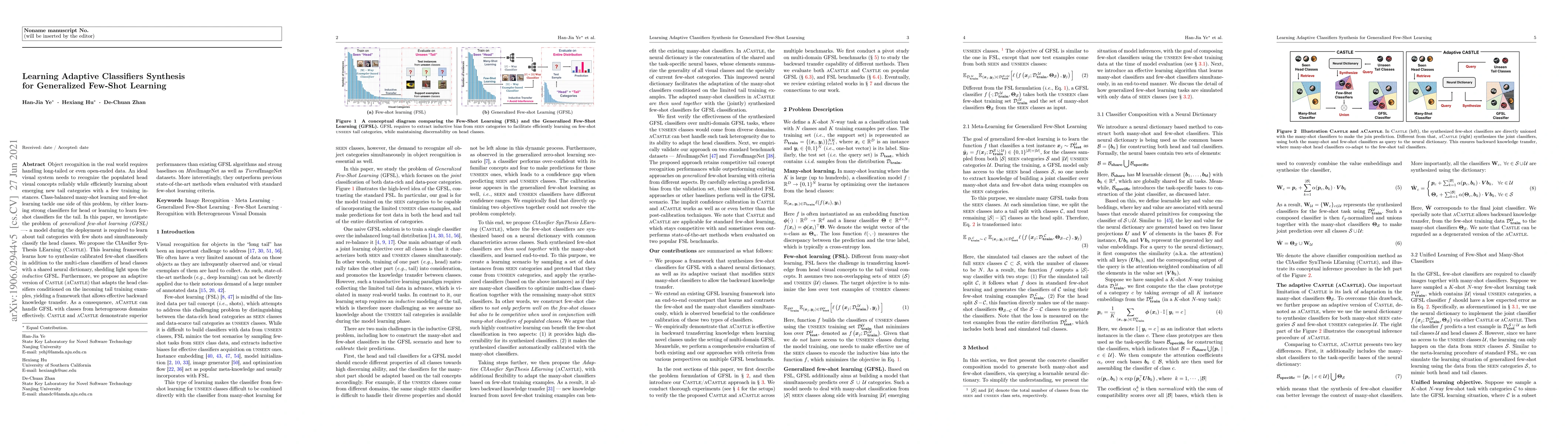Object recognition in the real-world requires handling long-tailed or even open-ended data. An ideal visual system needs to recognize the populated head visual concepts reliably and meanwhile efficiently learn about emerging new tail categories with a few training instances. Class-balanced many-shot learning and few-shot learning tackle one side of this problem, by either learning strong classifiers for head or learning to learn few-shot classifiers for the tail. In this paper, we investigate the problem of generalized few-shot learning (GFSL) -- a model during the deployment is required to learn about tail categories with few shots and simultaneously classify the head classes. We propose the ClAssifier SynThesis LEarning (CASTLE), a learning framework that learns how to synthesize calibrated few-shot classifiers in addition to the multi-class classifiers of head classes with a shared neural dictionary, shedding light upon the inductive GFSL. Furthermore, we propose an adaptive version of CASTLE (ACASTLE) that adapts the head classifiers conditioned on the incoming tail training examples, yielding a framework that allows effective backward knowledge transfer. As a consequence, ACASTLE can handle GFSL with classes from heterogeneous domains effectively. CASTLE and ACASTLE demonstrate superior performances than existing GFSL algorithms and strong baselines on MiniImageNet as well as TieredImageNet datasets. More interestingly, they outperform previous state-of-the-art methods when evaluated with standard few-shot learning criteria.