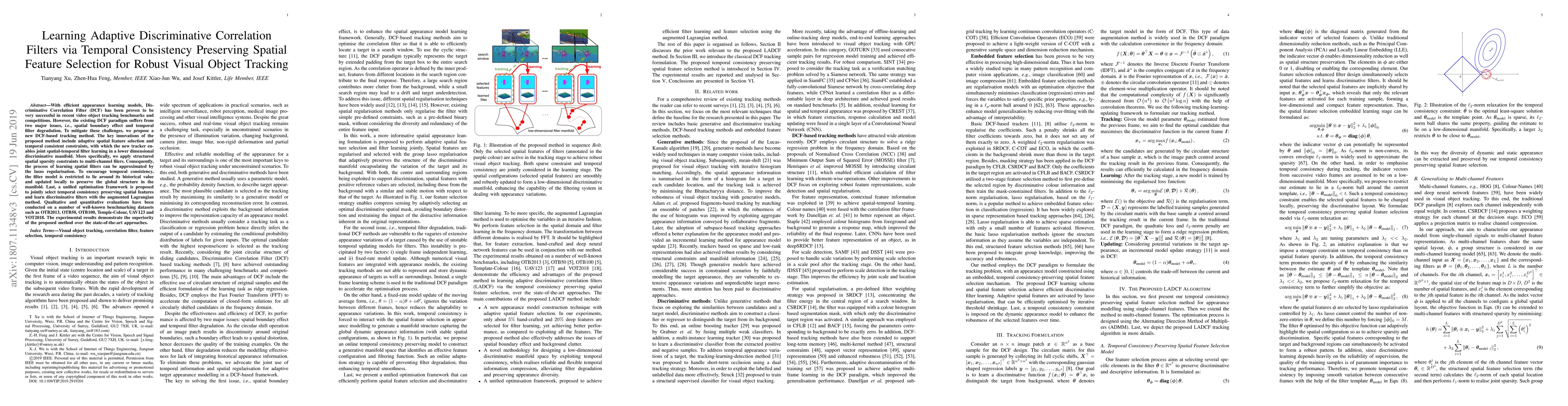 This paper proposes a novel adaptive discriminative correlation filter (DCF) method for robust visual tracking, addressing spatial boundary effects and temporal filter degradation through adaptive spatial feature selection and temporal consistency constraints. The method employs structured spatial sparsity and temporal consistency to learn discriminative filters in a lower-dimensional manifold, achieving superior performance on multiple benchmarking datasets.