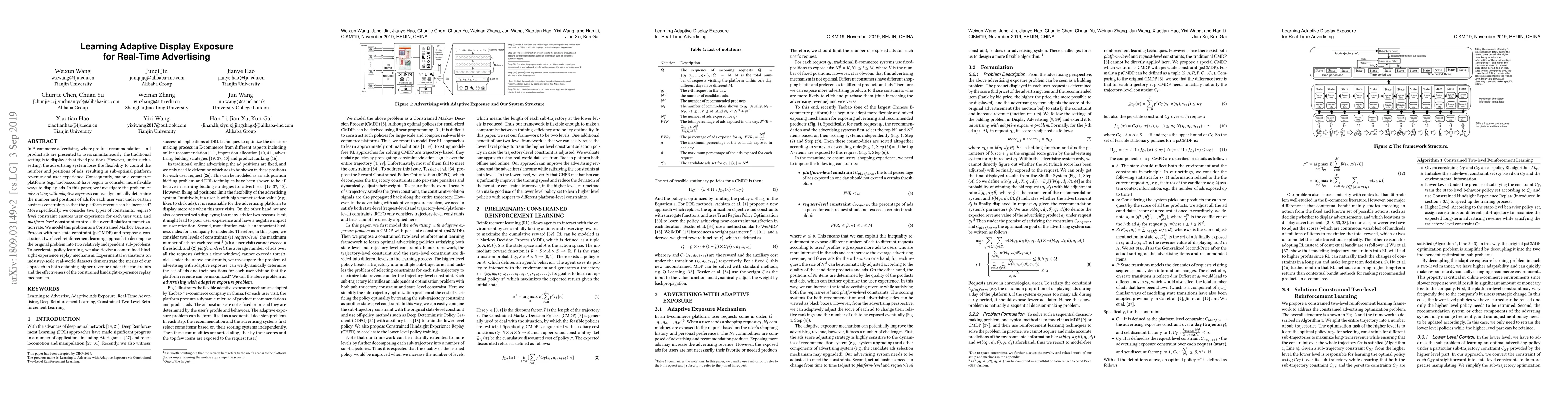 This paper explores adaptive display exposure for real-time e-commerce advertising, proposing a constrained two-level reinforcement learning approach to dynamically determine ad number and positions to maximize platform revenue while ensuring user experience and monetization rates. Experimental results show improved revenue and the effectiveness of a constrained hindsight experience replay mechanism.