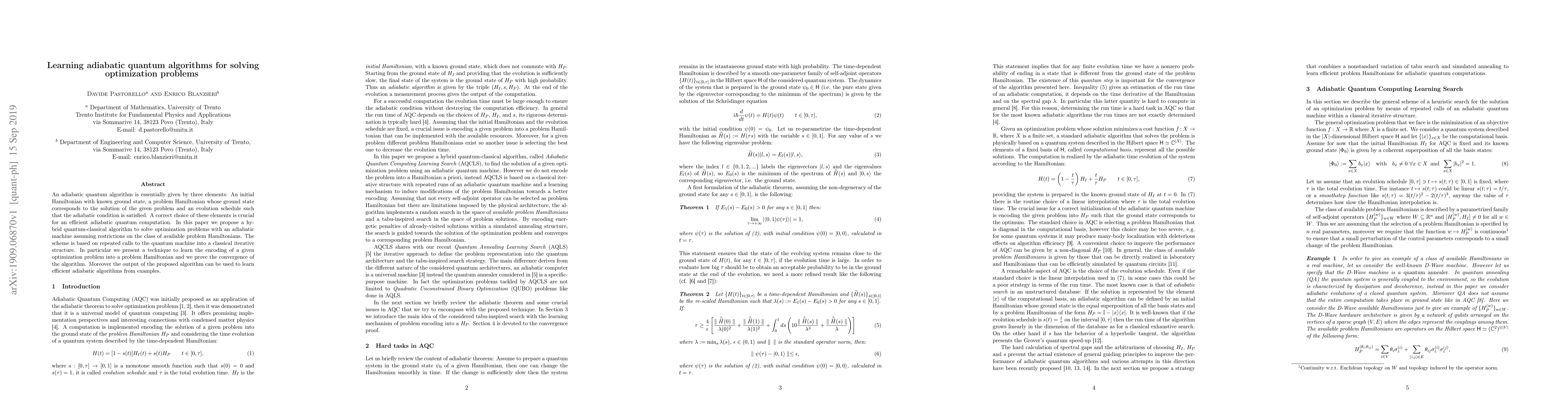 This paper proposes a hybrid quantum-classical algorithm to solve optimization problems using adiabatic quantum computation, focusing on learning the encoding of problems into suitable problem Hamiltonians. The method iteratively integrates quantum computations within a classical framework, demonstrating convergence and the potential to learn efficient adiabatic algorithms from examples.