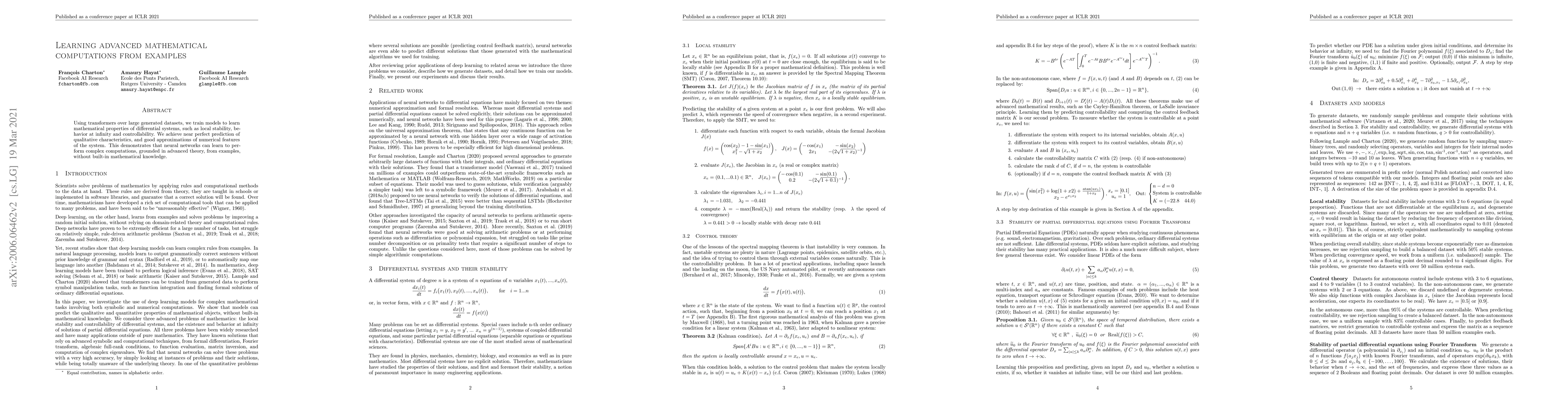 Using transformers over large generated datasets, we train models to learn mathematical properties of differential systems, such as local stability, behavior at infinity and controllability. We achieve near perfect prediction of qualitative characteristics, and good approximations of numerical features of the system. This demonstrates that neural networks can learn to perform complex computations, grounded in advanced theory, from examples, without built-in mathematical knowledge.