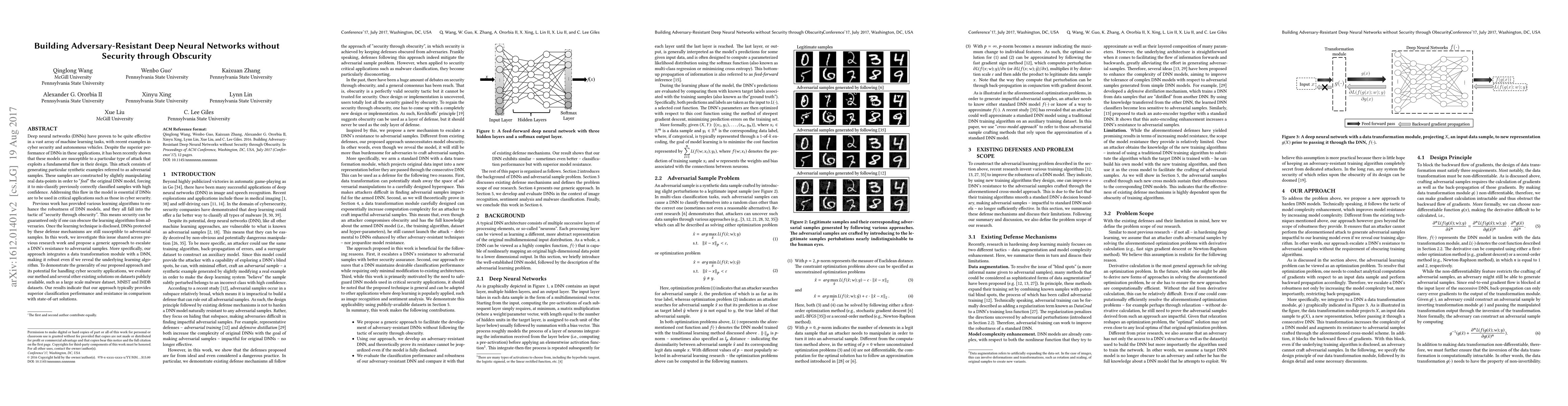 Deep neural networks (DNNs) have proven to be quite effective in a vast array of machine learning tasks, with recent examples in cyber security and autonomous vehicles. Despite the superior performance of DNNs in these applications, it has been recently shown that these models are susceptible to a particular type of attack that exploits a fundamental flaw in their design. This attack consists of generating particular synthetic examples referred to as adversarial samples. These samples are constructed by slightly manipulating real data-points in order to "fool" the original DNN model, forcing it to mis-classify previously correctly classified samples with high confidence. Addressing this flaw in the model is essential if DNNs are to be used in critical applications such as those in cyber security. Previous work has provided various learning algorithms to enhance the robustness of DNN models, and they all fall into the tactic of "security through obscurity". This means security can be guaranteed only if one can obscure the learning algorithms from adversaries. Once the learning technique is disclosed, DNNs protected by these defense mechanisms are still susceptible to adversarial samples. In this work, we investigate this issue shared across previous research work and propose a generic approach to escalate a DNN's resistance to adversarial samples. More specifically, our approach integrates a data transformation module with a DNN, making it robust even if we reveal the underlying learning algorithm. To demonstrate the generality of our proposed approach and its potential for handling cyber security applications, we evaluate our method and several other existing solutions on datasets publicly available. Our results indicate that our approach typically provides superior classification performance and resistance in comparison with state-of-art solutions.