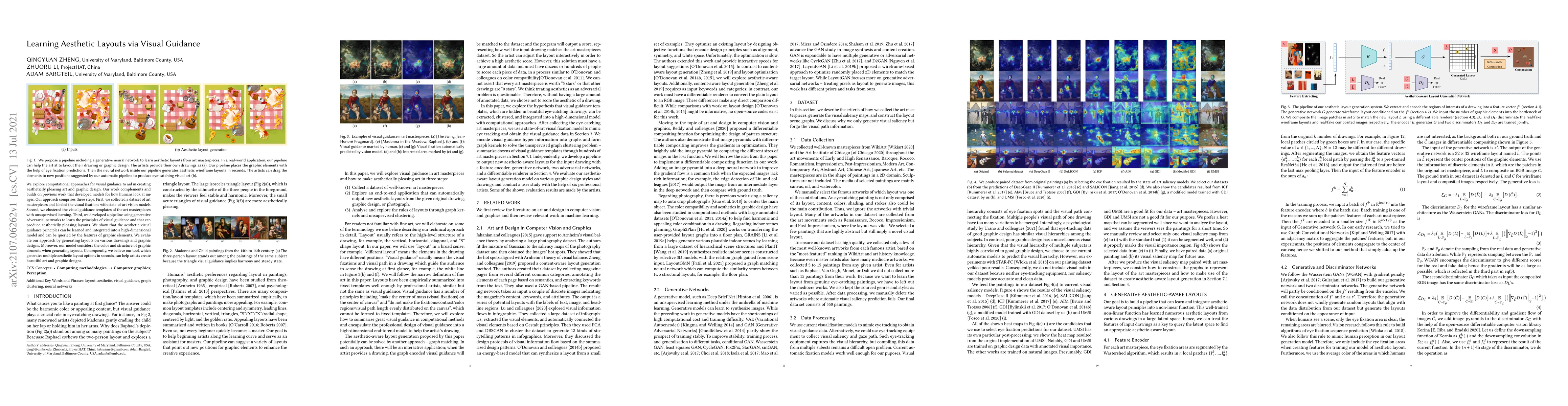 We explore computational approaches for visual guidance to aid in creating aesthetically pleasing art and graphic design. Our work complements and builds on previous work that developed models for how humans look at images. Our approach comprises three steps. First, we collected a dataset of art masterpieces and labeled the visual fixations with state-of-art vision models. Second, we clustered the visual guidance templates of the art masterpieces with unsupervised learning. Third, we developed a pipeline using generative adversarial networks to learn the principles of visual guidance and that can produce aesthetically pleasing layouts. We show that the aesthetic visual guidance principles can be learned and integrated into a high-dimensional model and can be queried by the features of graphic elements. We evaluate our approach by generating layouts on various drawings and graphic designs. Moreover, our model considers the color and structure of graphic elements when generating layouts. Consequently, we believe our tool, which generates multiple aesthetic layout options in seconds, can help artists create beautiful art and graphic designs.