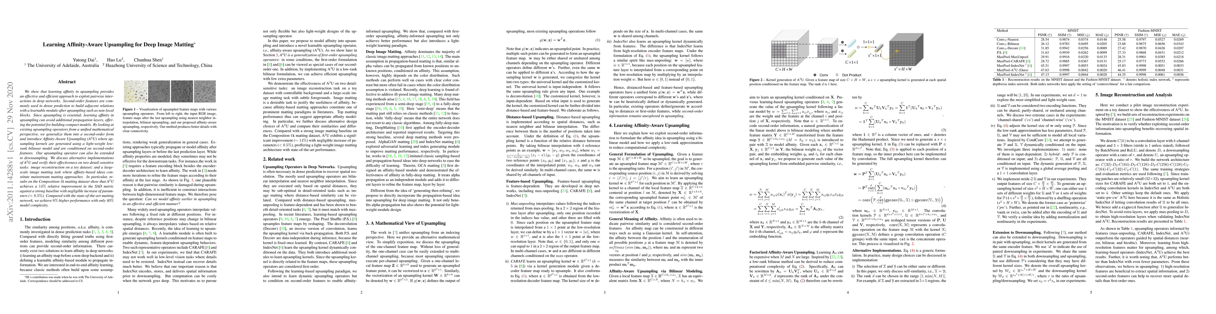 We show that learning affinity in upsampling provides an effective and efficient approach to exploit pairwise interactions in deep networks. Second-order features are commonly used in dense prediction to build adjacent relations with a learnable module after upsampling such as non-local blocks. Since upsampling is essential, learning affinity in upsampling can avoid additional propagation layers, offering the potential for building compact models. By looking at existing upsampling operators from a unified mathematical perspective, we generalize them into a second-order form and introduce Affinity-Aware Upsampling (A2U) where upsampling kernels are generated using a light-weight lowrank bilinear model and are conditioned on second-order features. Our upsampling operator can also be extended to downsampling. We discuss alternative implementations of A2U and verify their effectiveness on two detail-sensitive tasks: image reconstruction on a toy dataset; and a largescale image matting task where affinity-based ideas constitute mainstream matting approaches. In particular, results on the Composition-1k matting dataset show that A2U achieves a 14% relative improvement in the SAD metric against a strong baseline with negligible increase of parameters (<0.5%). Compared with the state-of-the-art matting network, we achieve 8% higher performance with only 40% model complexity.
