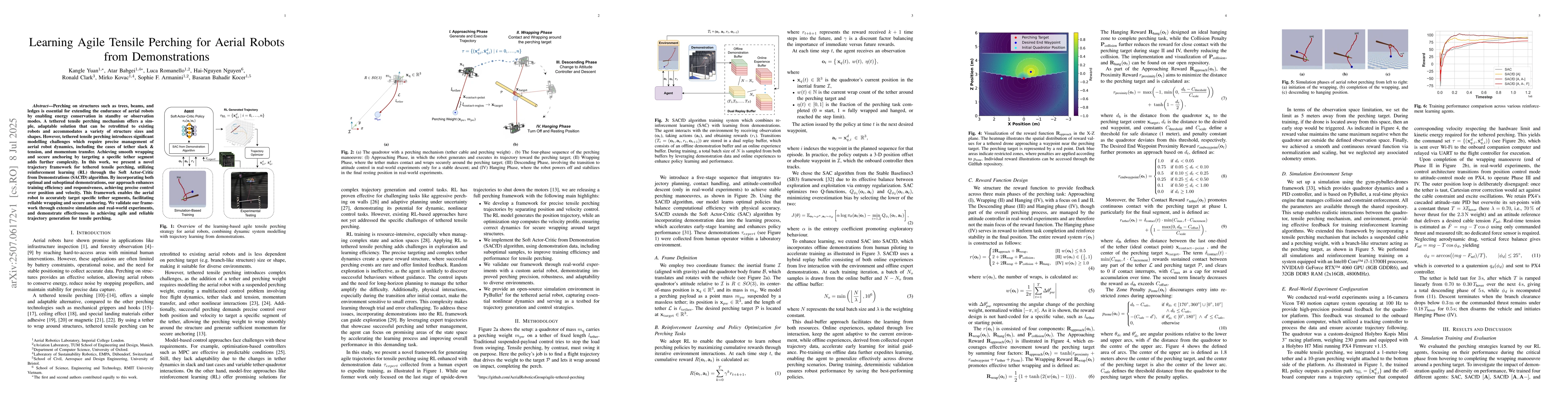 Perching on structures such as trees, beams, and ledges is essential for extending the endurance of aerial robots by enabling energy conservation in standby or observation modes. A tethered tensile perching mechanism offers a simple, adaptable solution that can be retrofitted to existing robots and accommodates a variety of structure sizes and shapes. However, tethered tensile perching introduces significant modelling challenges which require precise management of aerial robot dynamics, including the cases of tether slack & tension, and momentum transfer. Achieving smooth wrapping and secure anchoring by targeting a specific tether segment adds further complexity. In this work, we present a novel trajectory framework for tethered tensile perching, utilizing reinforcement learning (RL) through the Soft Actor-Critic from Demonstrations (SACfD) algorithm. By incorporating both optimal and suboptimal demonstrations, our approach enhances training efficiency and responsiveness, achieving precise control over position and velocity. This framework enables the aerial robot to accurately target specific tether segments, facilitating reliable wrapping and secure anchoring. We validate our framework through extensive simulation and real-world experiments, and demonstrate effectiveness in achieving agile and reliable trajectory generation for tensile perching.