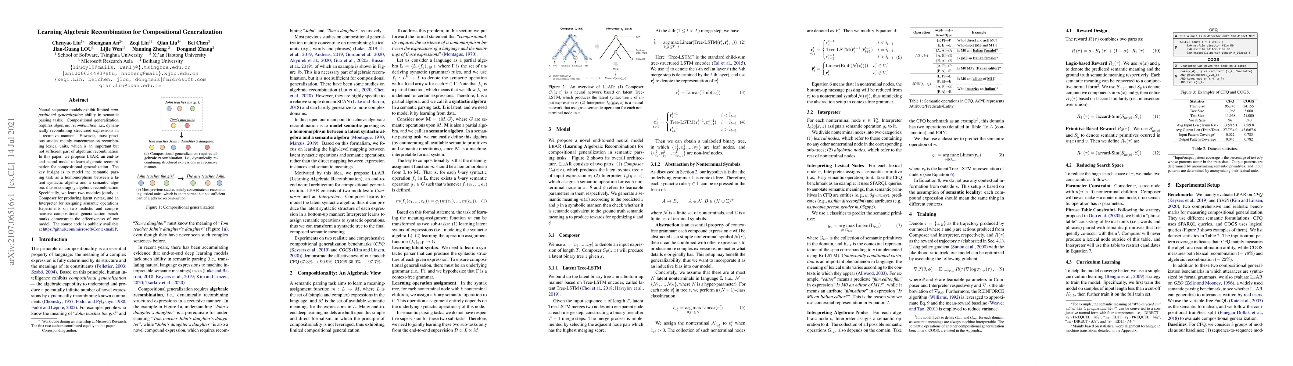 This paper introduces LeAR, a neural model for enhancing compositional generalization in semantic parsing tasks by learning algebraic recombination through a homomorphism between syntactic and semantic algebras. The model comprises a Composer and an Interpreter, achieving better performance on compositional generalization benchmarks.