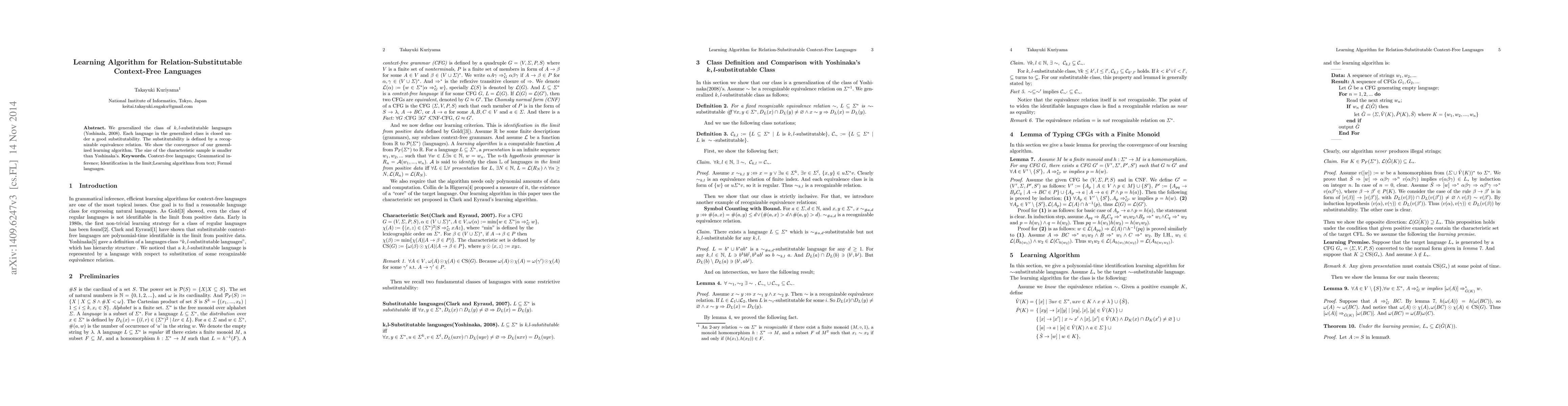 We generalized the class of $k,l$-substitutable languages (Yoshinala, 2008). Each language in the generalized class is closed under a good substitutability. The substitutability is defined by a recognizable equivalence relation. We show the convergence of our generalized learning algorithm. The size of the characteristic sample is smaller than Yoshinaka's.
