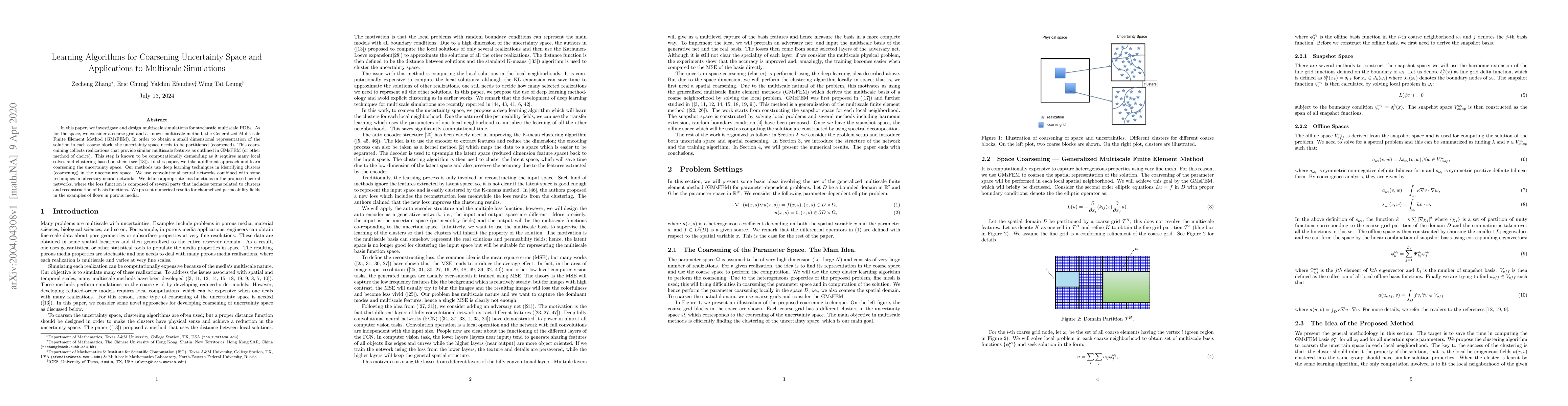 In this paper, we investigate and design multiscale simulations for stochastic multiscale PDEs. As for the space, we consider a coarse grid and a known multiscale method, the Generalized Multiscale Finite Element Method (GMsFEM). In order to obtain a small dimensional representation of the solution in each coarse block, the uncertainty space needs to be partitioned (coarsened). This coarsening collects realizations that provide similar multiscale features as outlined in GMsFEM (or other method of choice). This step is known to be computationally demanding as it requires many local solves and clustering based on them. In this paper, we take a different approach and learn coarsening the uncertainty space. Our methods use deep learning techniques in identifying clusters(coarsening) in the uncertainty space. We use convolutional neural networks combined with some techniques in adversary neural networks. We define appropriate loss functions in the proposed neural networks, where the loss function is composed of several parts that includes terms related to clusters and reconstruction of basis functions. We present numerical results for channelized permeability fields in the examples of flows in porous media.