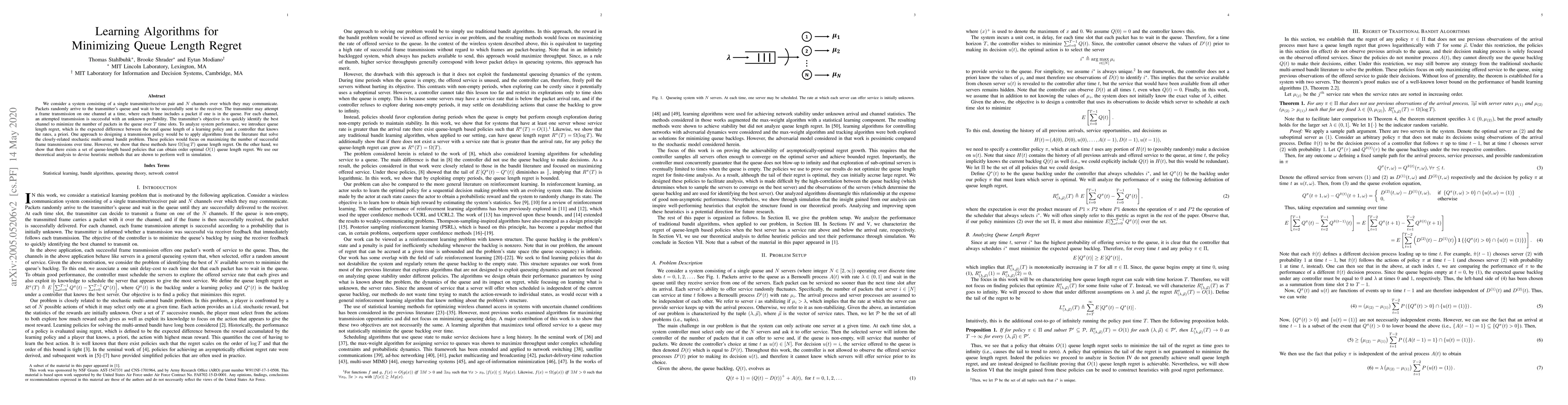 Researchers developed learning algorithms to optimize queue length regret in a communication system with multiple channels, achieving order-optimal regret of $O(1)$.