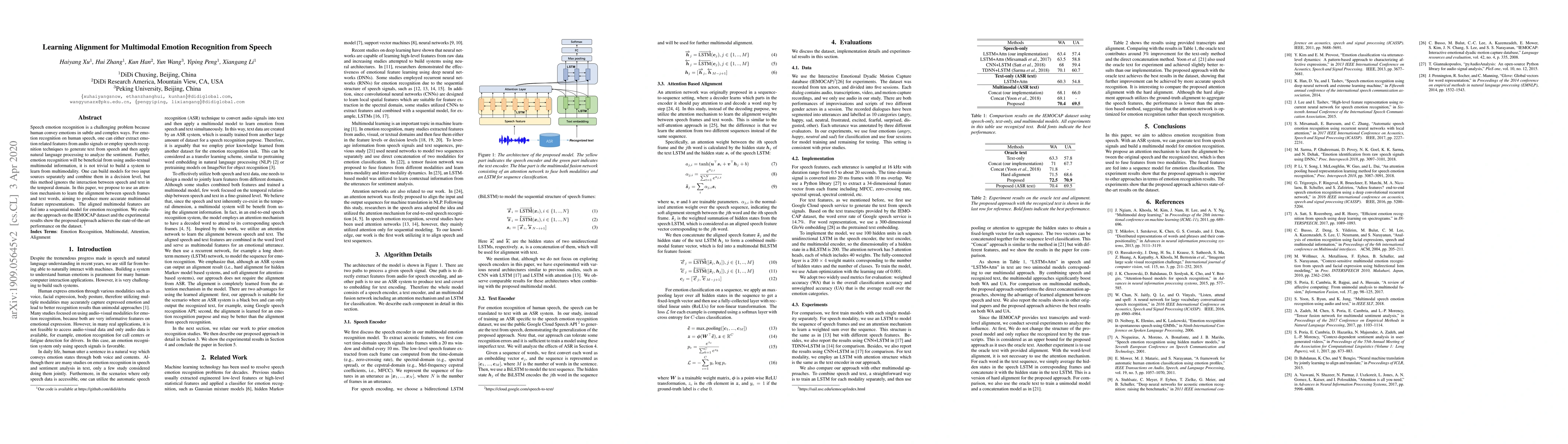 This paper proposes an attention mechanism to learn alignment between speech frames and text words for multimodal emotion recognition, achieving state-of-the-art performance on the IEMOCAP dataset by leveraging temporal interactions between audio and textual features.