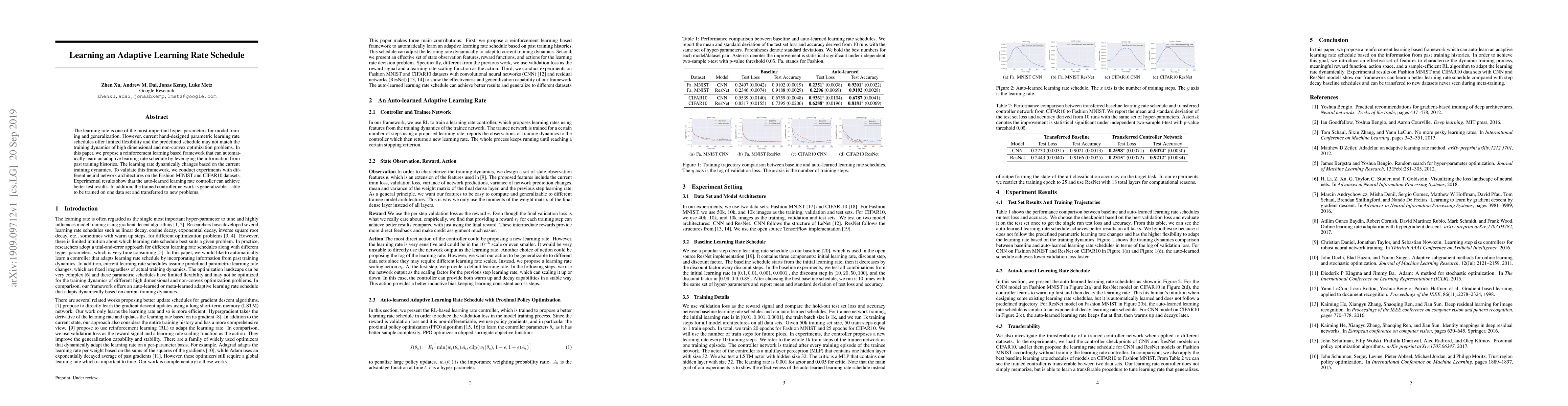 This paper proposes a reinforcement learning framework to automatically determine adaptive learning rate schedules, improving model training and generalization. Experiments on Fashion MINIST and CIFAR10 datasets demonstrate better performance and generalizability of the auto-learned learning rate controller compared to traditional schedules.