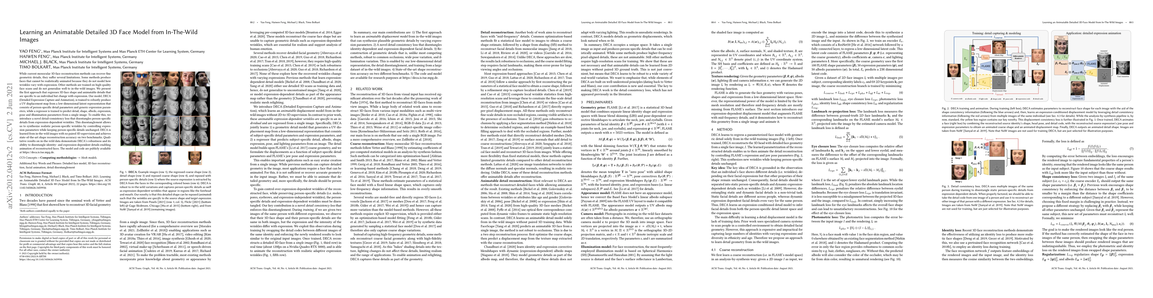 This paper presents DECA, a novel approach to reconstruct detailed 3D face models from in-the-wild images that can be realistically animated. It disentangles person-specific details from expression-dependent wrinkles, enabling realistic animation of reconstructed faces.