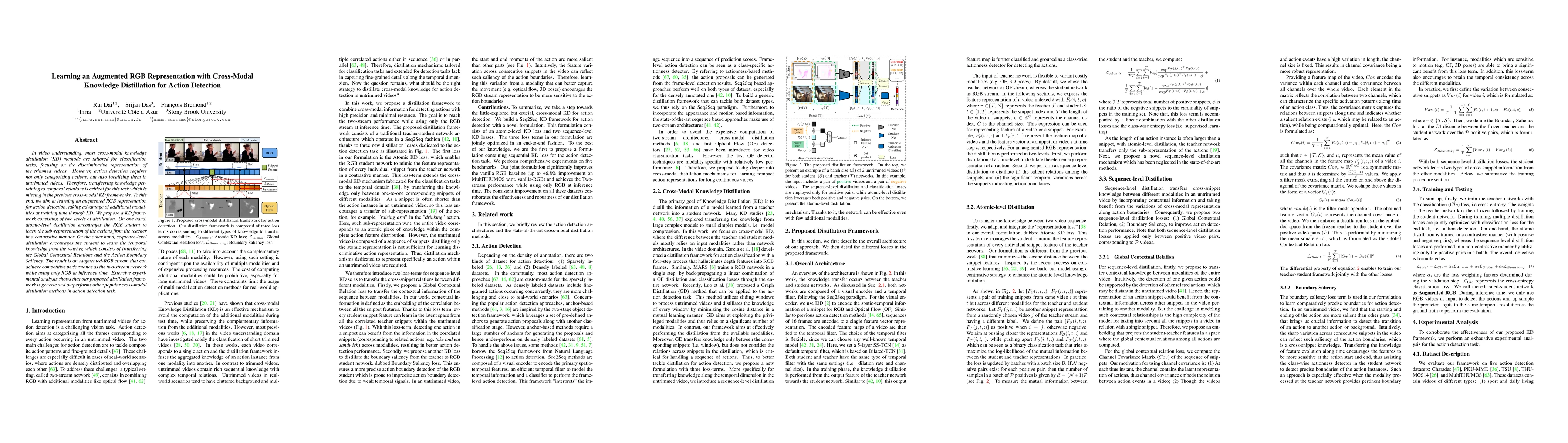 This paper proposes a cross-modal knowledge distillation framework for action detection in untrimmed videos, focusing on learning an augmented RGB representation. It introduces two levels of distillation: atomic-level for sub-representation learning and sequence-level for temporal knowledge transfer, resulting in an Augmented-RGB stream that matches two-stream network performance using only RGB input.