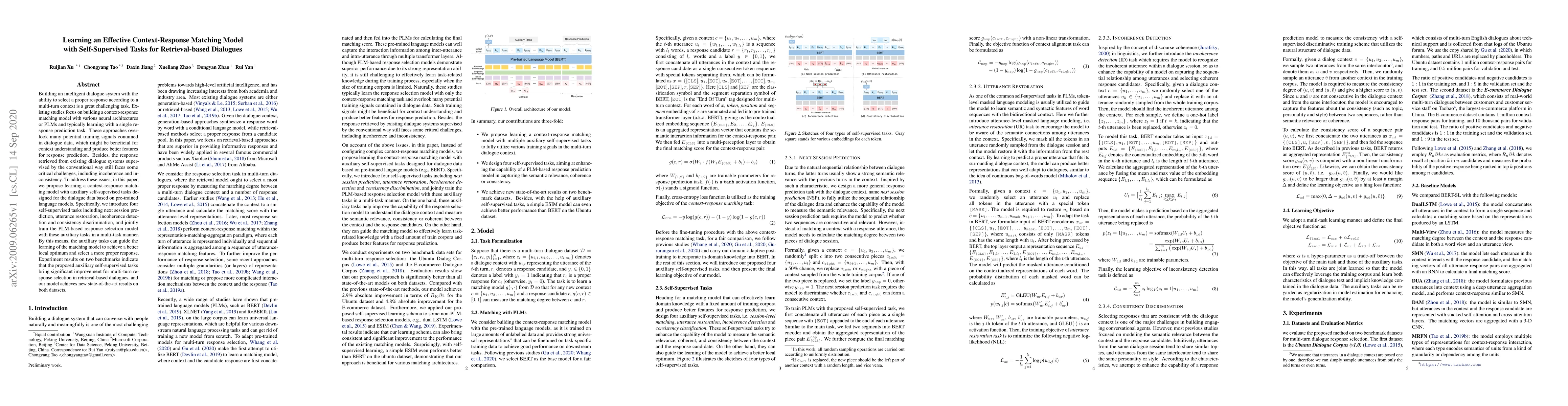 This paper proposes a context-response matching model enhanced by self-supervised tasks to improve retrieval-based dialogue systems, achieving better response selection through multi-task training with tasks like next session prediction and incoherence detection. The approach results in state-of-the-art performance on benchmark datasets.