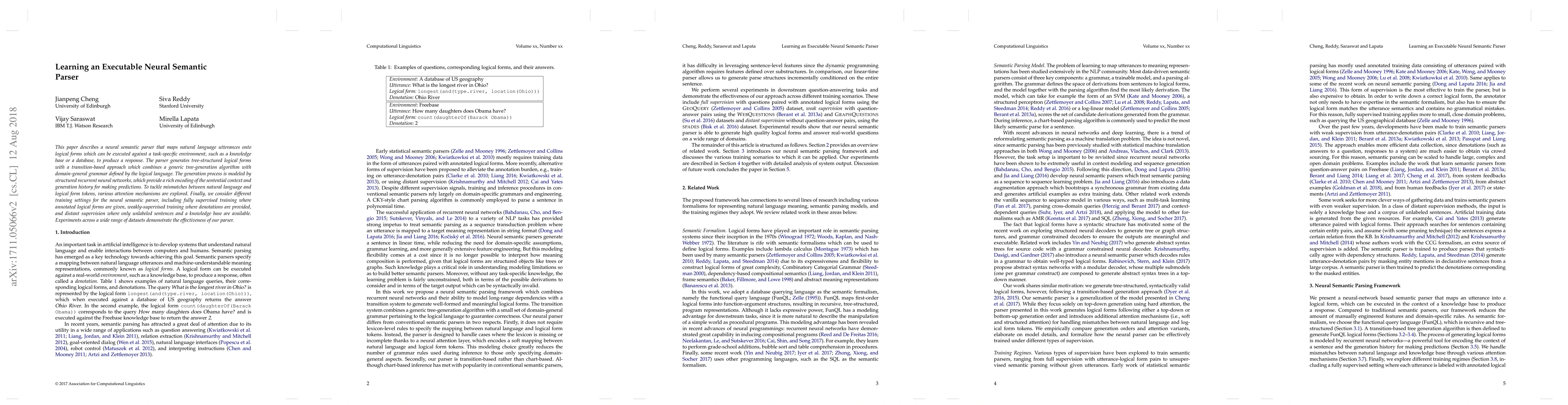 This paper presents a neural semantic parser that translates natural language into executable logical forms, employing a transition-based approach with structured recurrent neural networks and attention mechanisms. It explores various training methods, including supervised, weakly-supervised, and distant supervision, and demonstrates its effectiveness across multiple datasets.